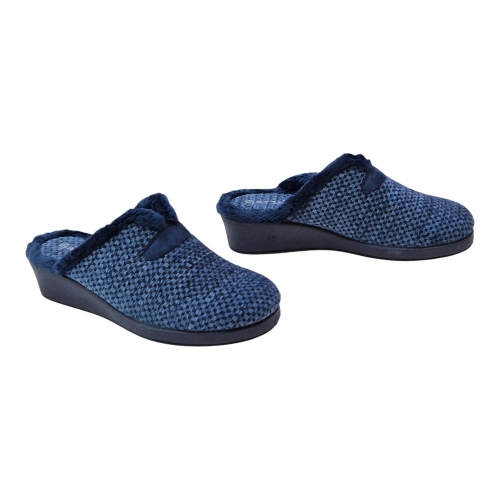Estas zapatillas presentan un elegante acabado exterior en tejido trenzado bitono (azul marino y negro), que aporta un toque sofisticado y una gran resistencia al uso diario. Su diseño tipo zueco descalzo permite calzarlas con total facilidad, siendo ideales para quienes buscan practicidad sin renunciar a la sujeción.