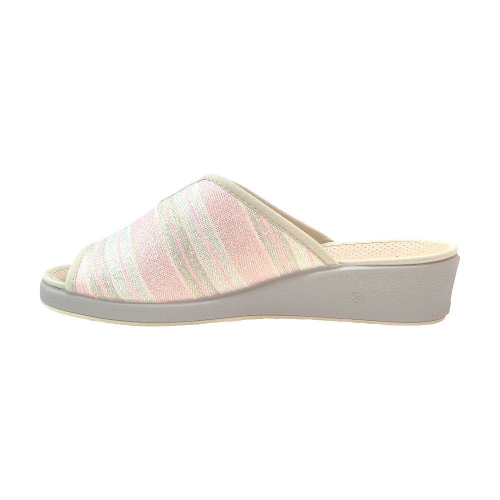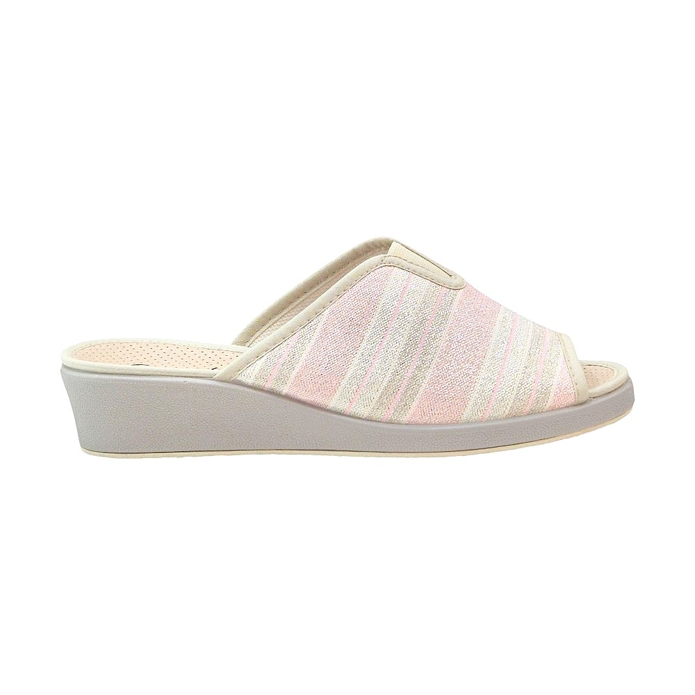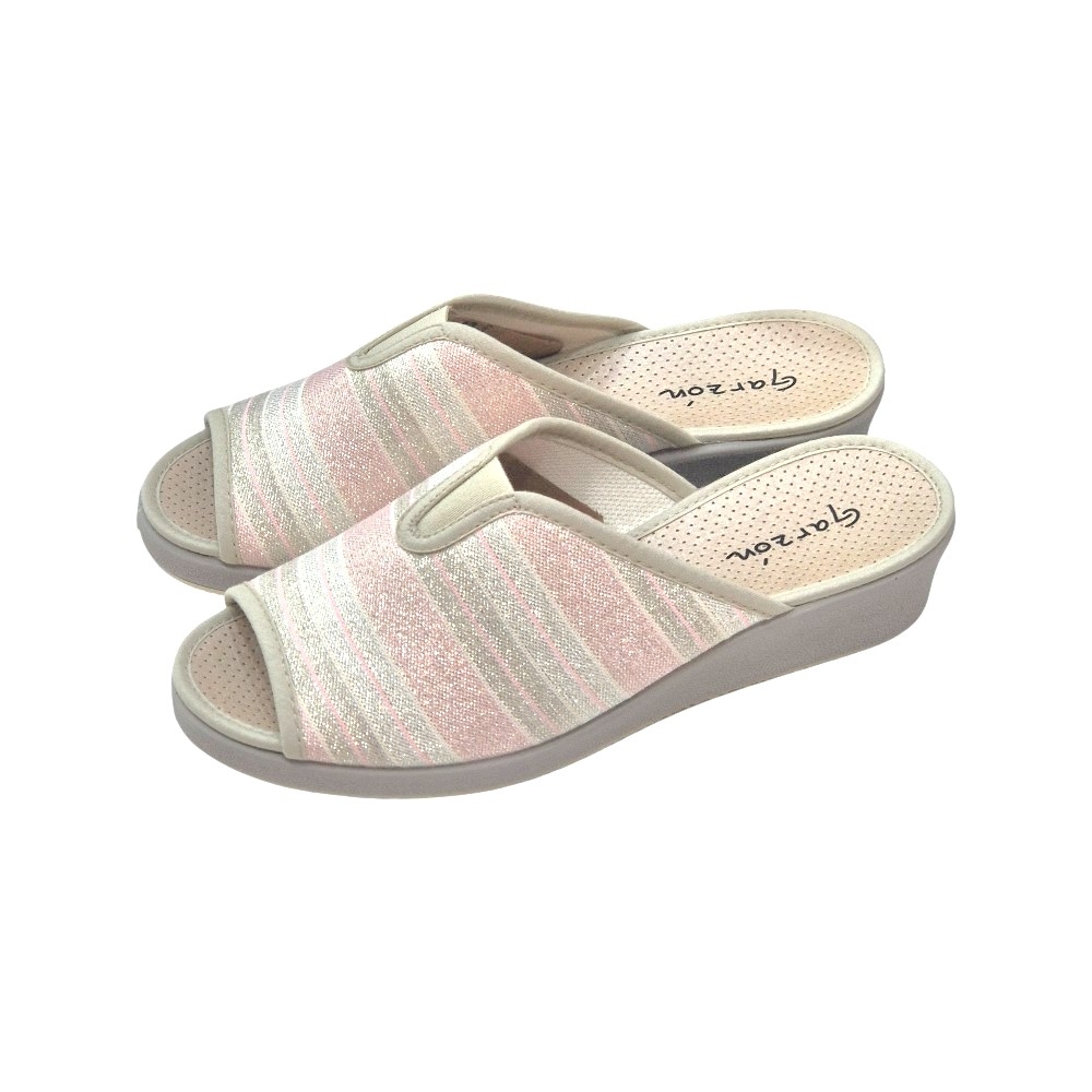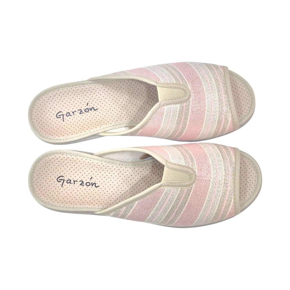 El acabado Talma Rosa destaca por su tejido de rayas horizontales que alternan tonos rosados, blancos y grises, todo ello realzado con un sutil acabado brillante (glitter) que aporta luz a cada paso. Su diseño de punta abierta (peep-toe) permite una transpiración óptima, siendo perfectas para las temporadas de entretiempo y verano.