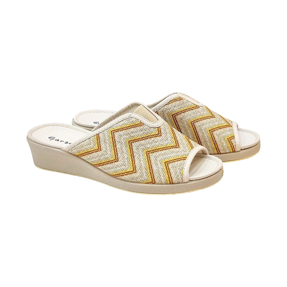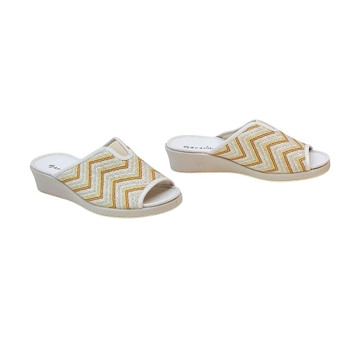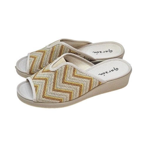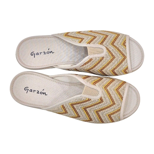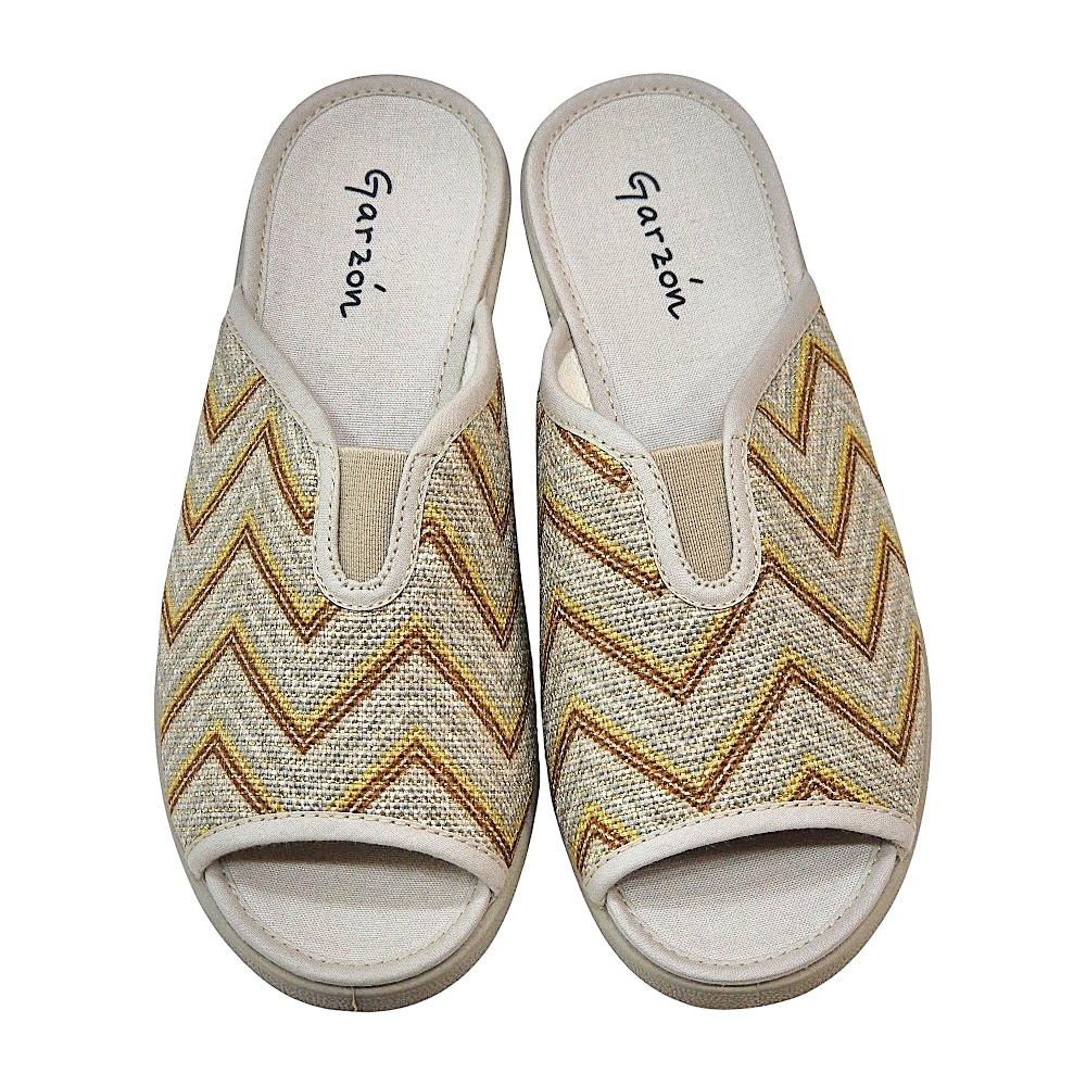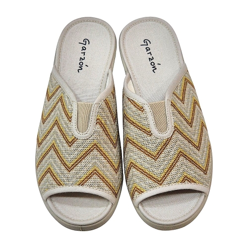 El acabado en Gris Perla Balle destaca por un elegante patrón de zig-zag bordado en tonos ocres y dorados, aportando un toque de luminosidad y sofisticación a tu calzado de descanso. La pala cuenta con un pequeño elástico central que permite que la zapatilla se adapte perfectamente al empeine con cada paso.