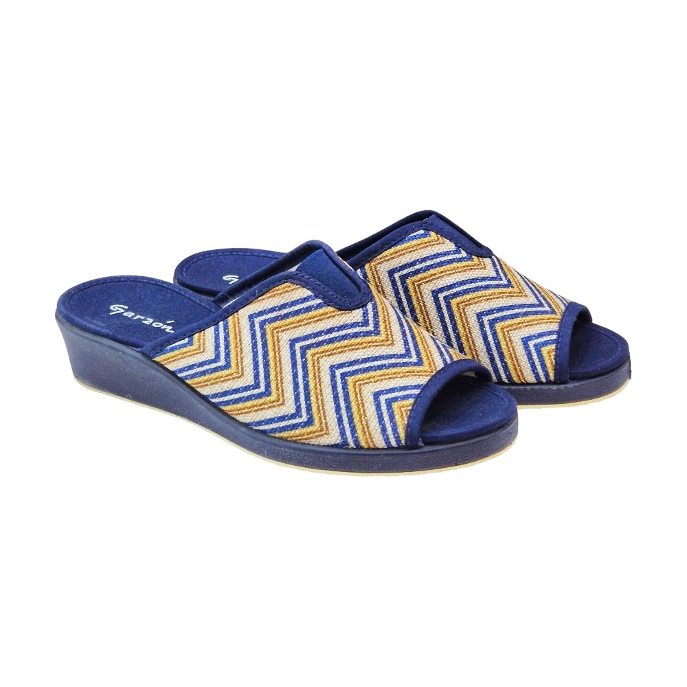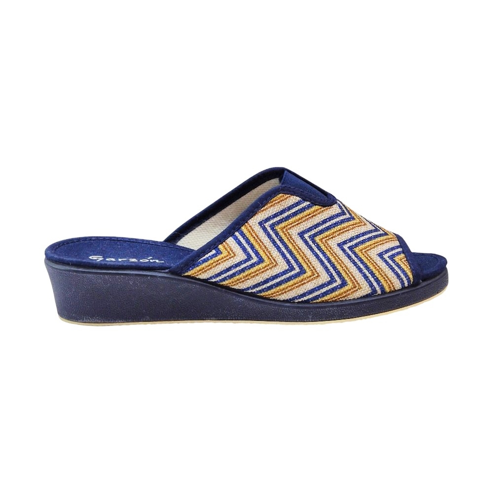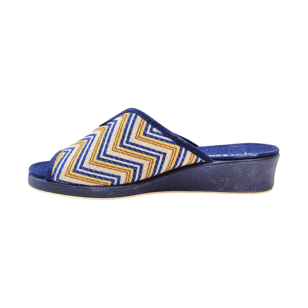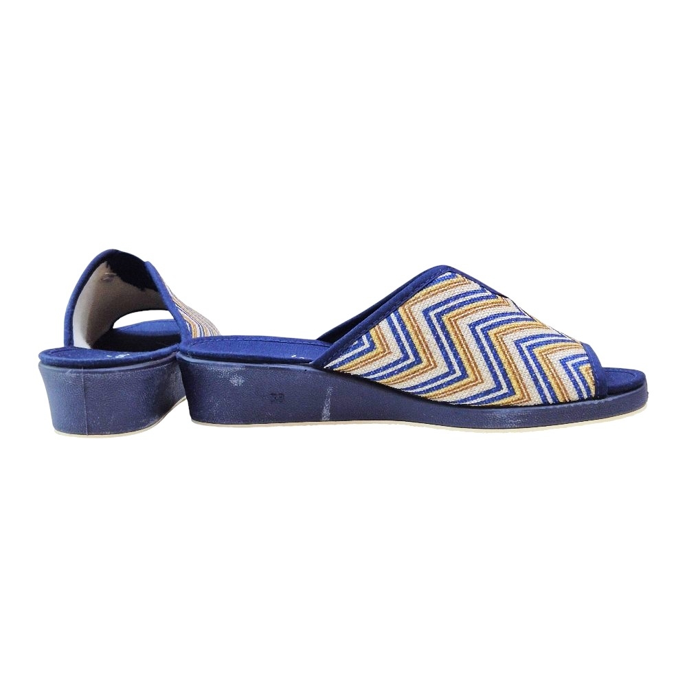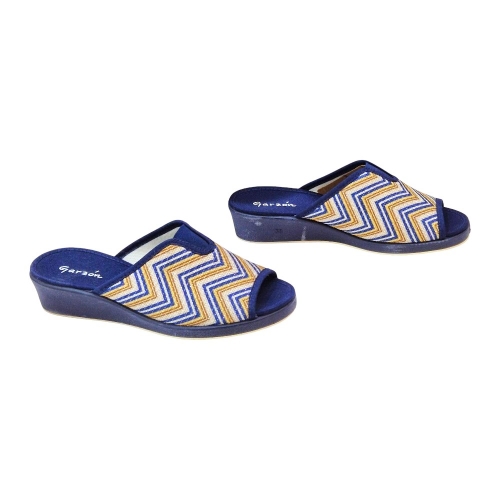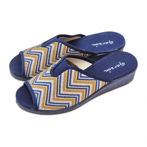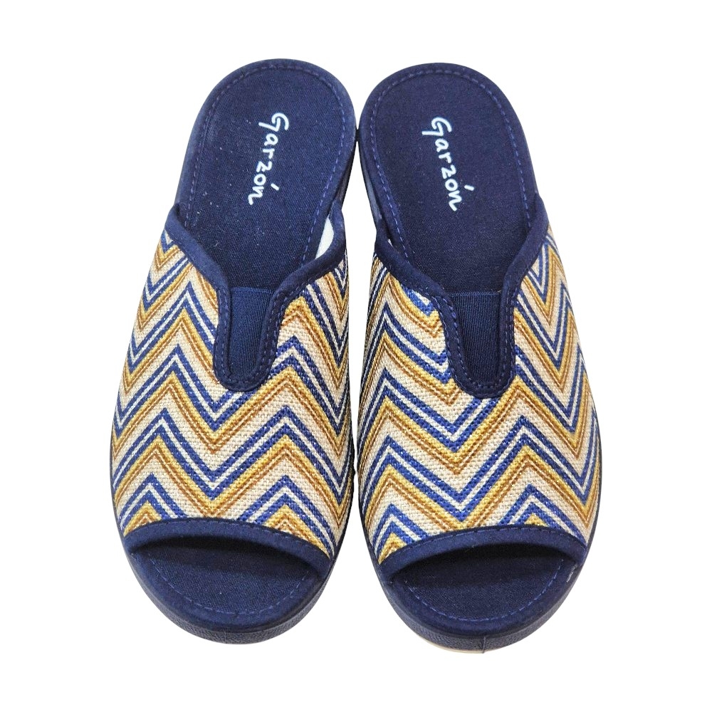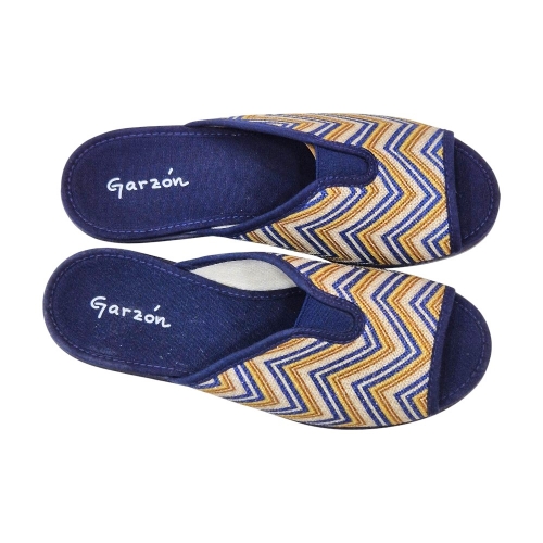Este modelo destaca por su elegante acabado en color Marino Balle, que presenta un llamativo estampado de zig-zag (chevron) en tonos azules, dorados y crema sobre una base de tejido transpirable. Su diseño de punta abierta permite una ventilación constante, ideal para mantener los pies frescos y cómodos en cualquier época del año.