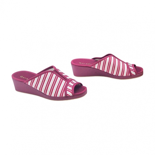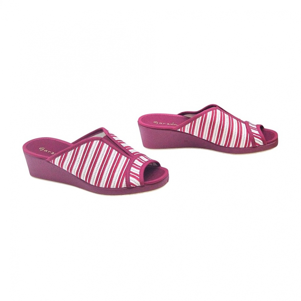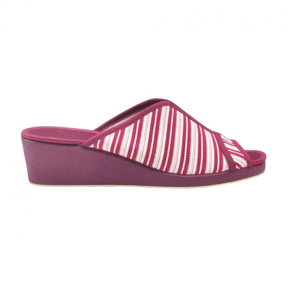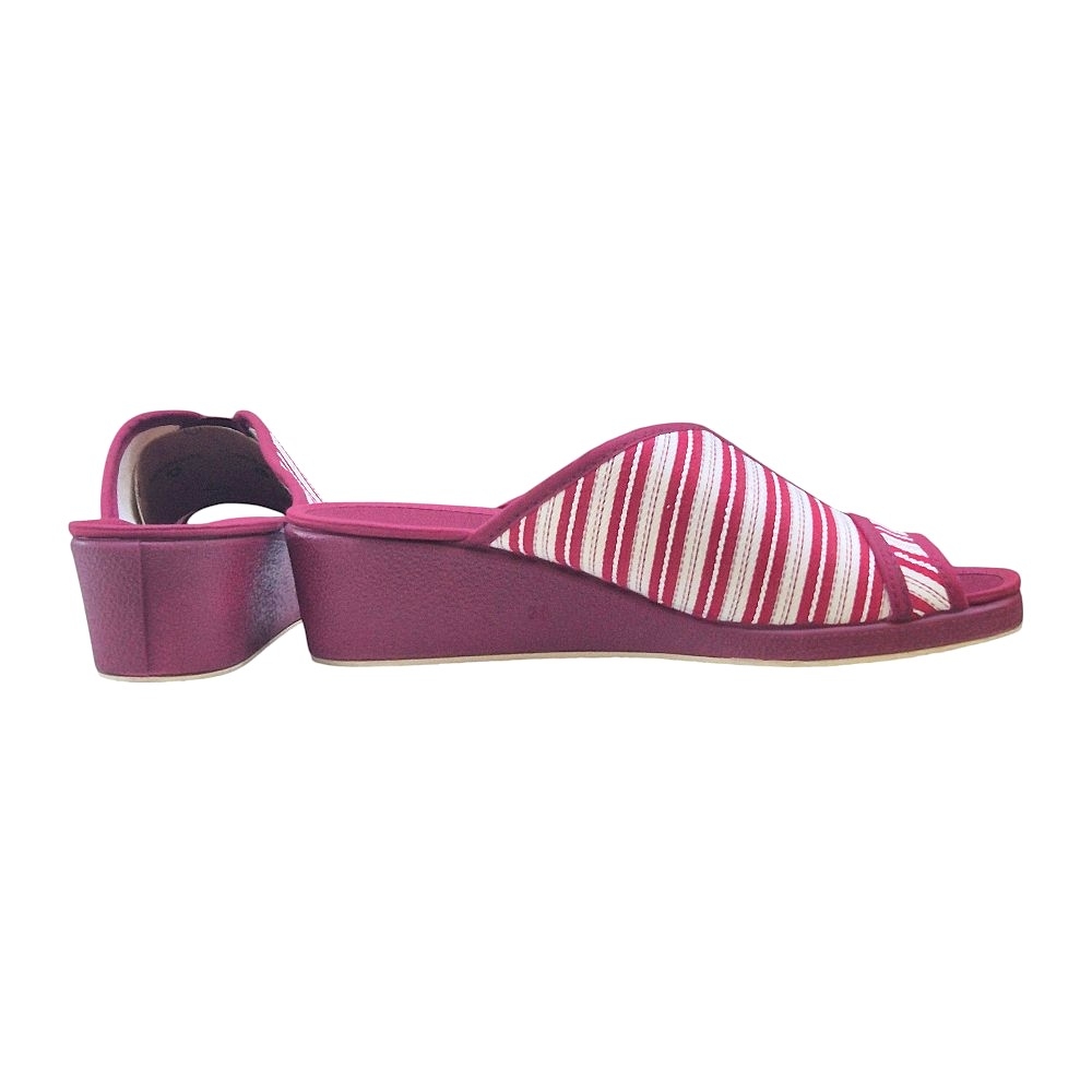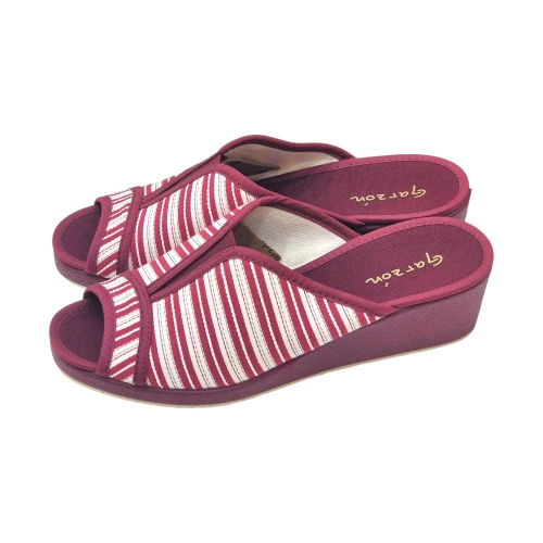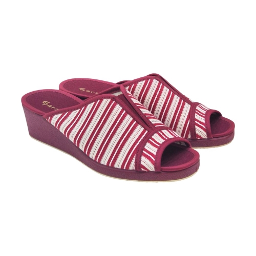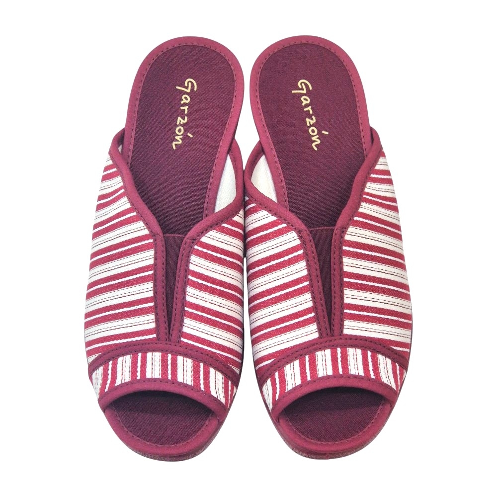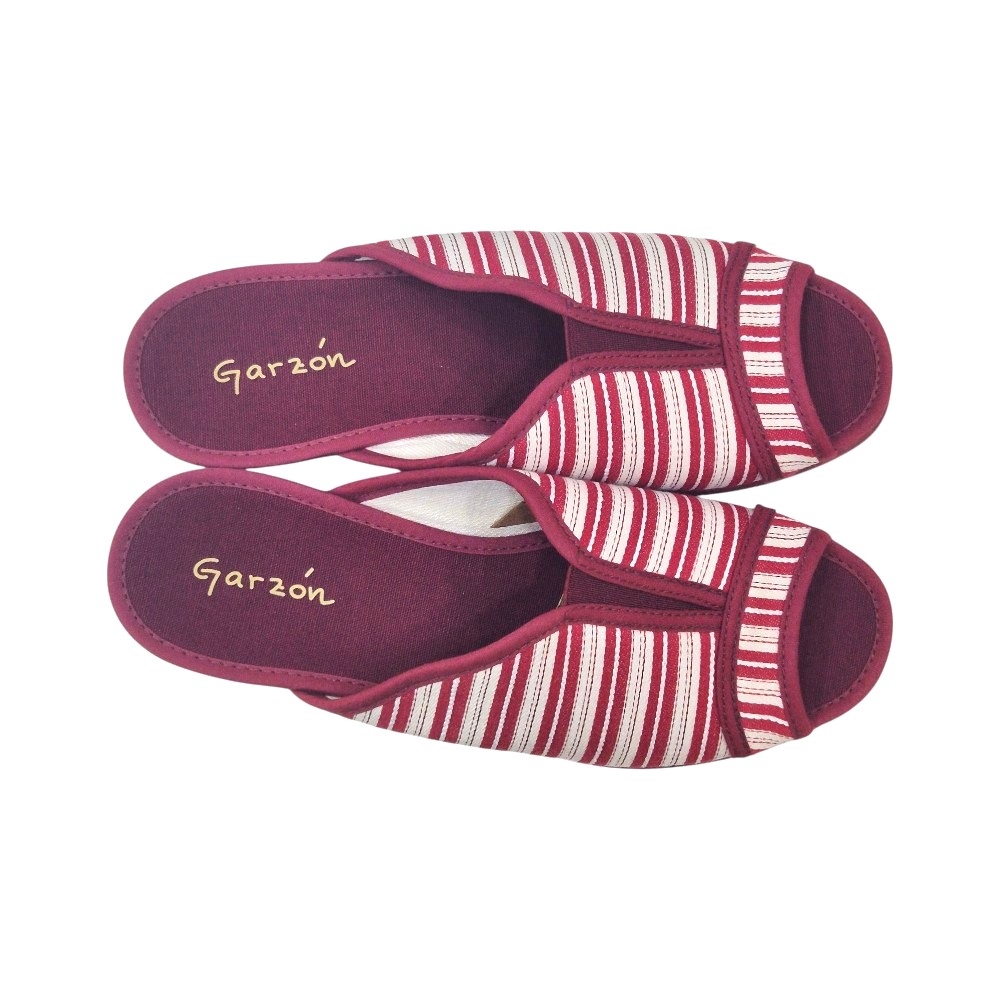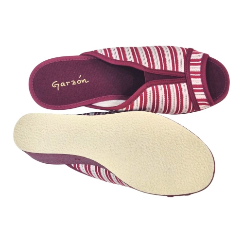 Este modelo destaca por su elegante tejido Velata en color Burdeos, con un clásico y veraniego patrón de rayas blancas que aporta un aire fresco y sofisticado. Su diseño de punta abierta permite que el pie respire constantemente, convirtiéndola en la aliada perfecta para las épocas de entretiempo o para quienes prefieren una sensación de libertad total sin opresiones.