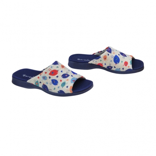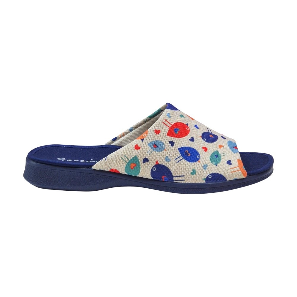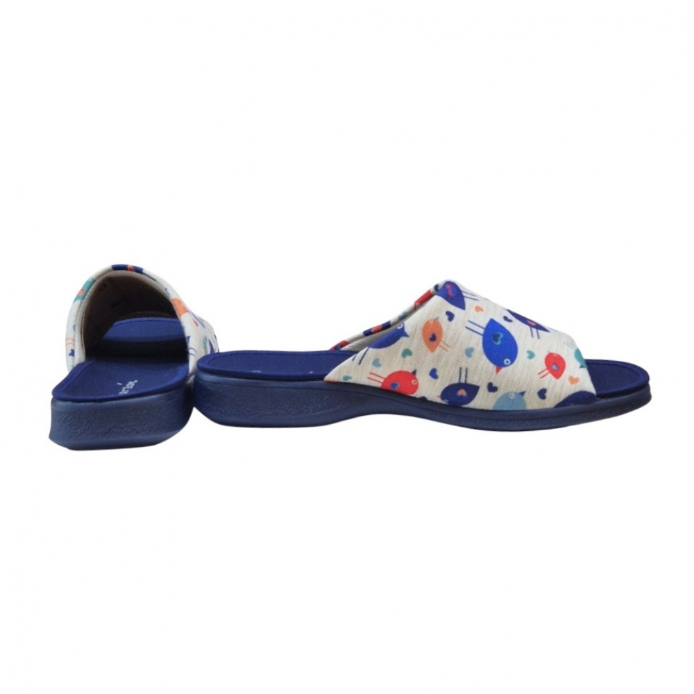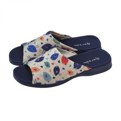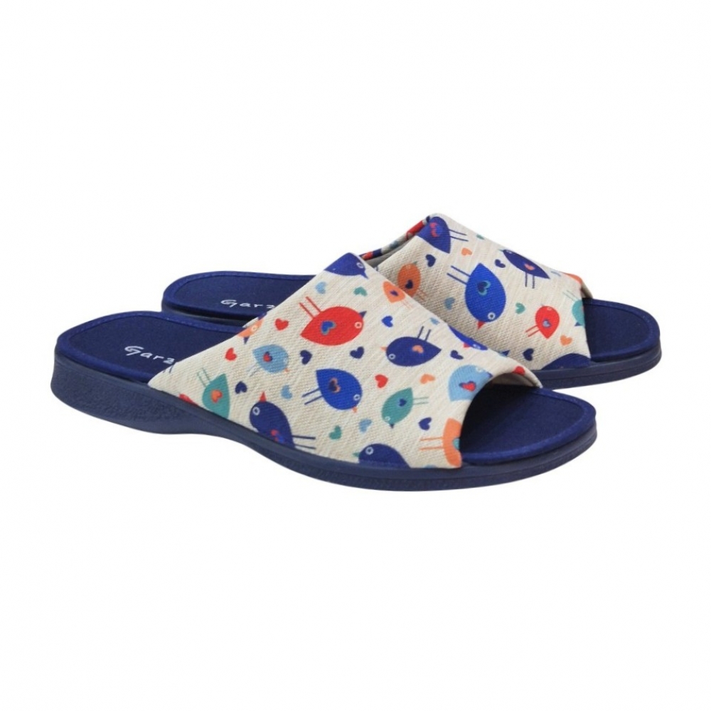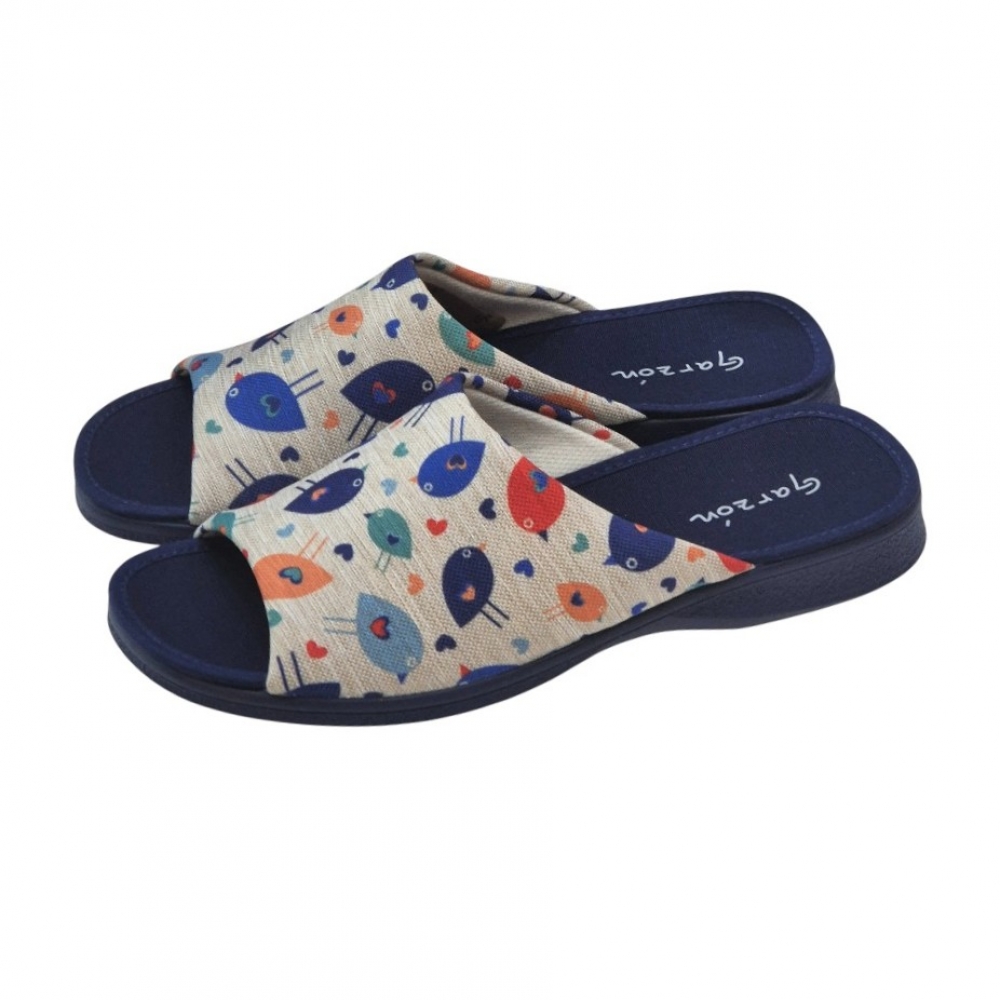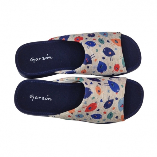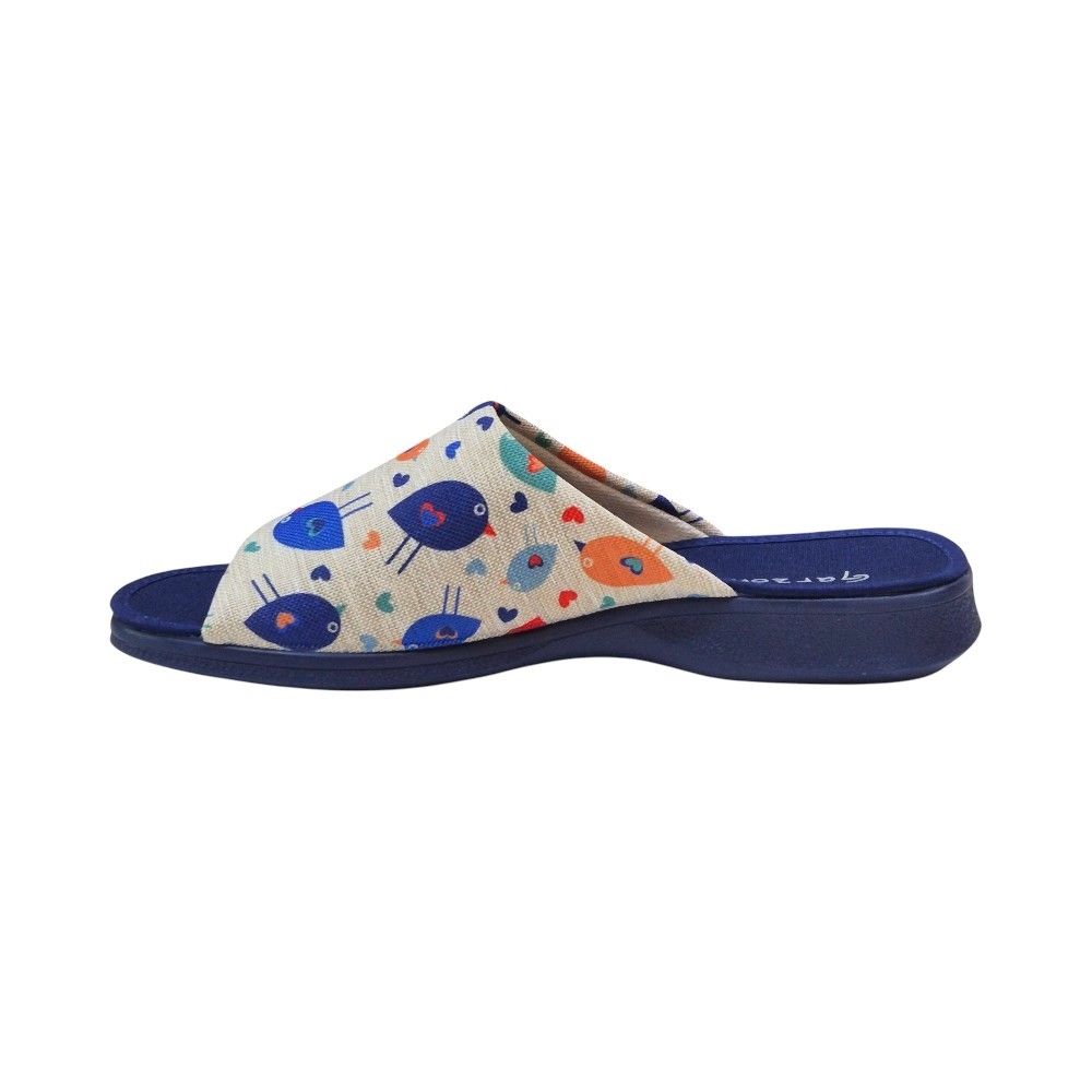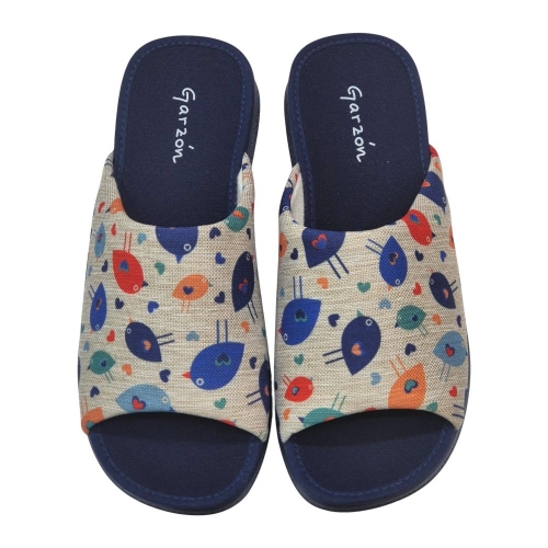 El modelo 2530.209 destaca por su vibrante estampado de pájaros multicolor sobre un fondo de tejido tipo lona en tono neutro. El contraste con la suela y la planta en color azul marino le aporta un aire elegante y moderno. Su diseño de puntera abierta es ideal para mantener el pie ventilado, haciendo de este par la opción perfecta para las épocas de entretiempo o para quienes prefieren no llevar el pie totalmente cerrado.
