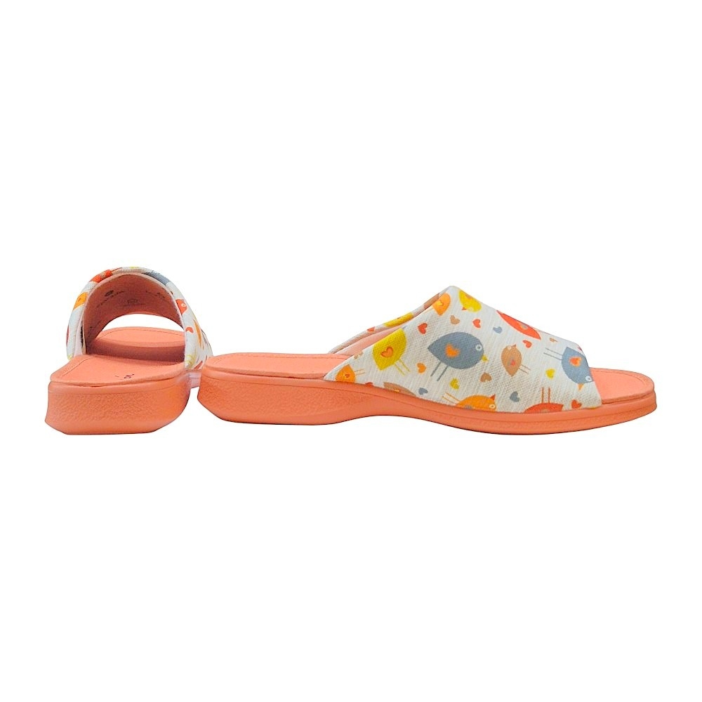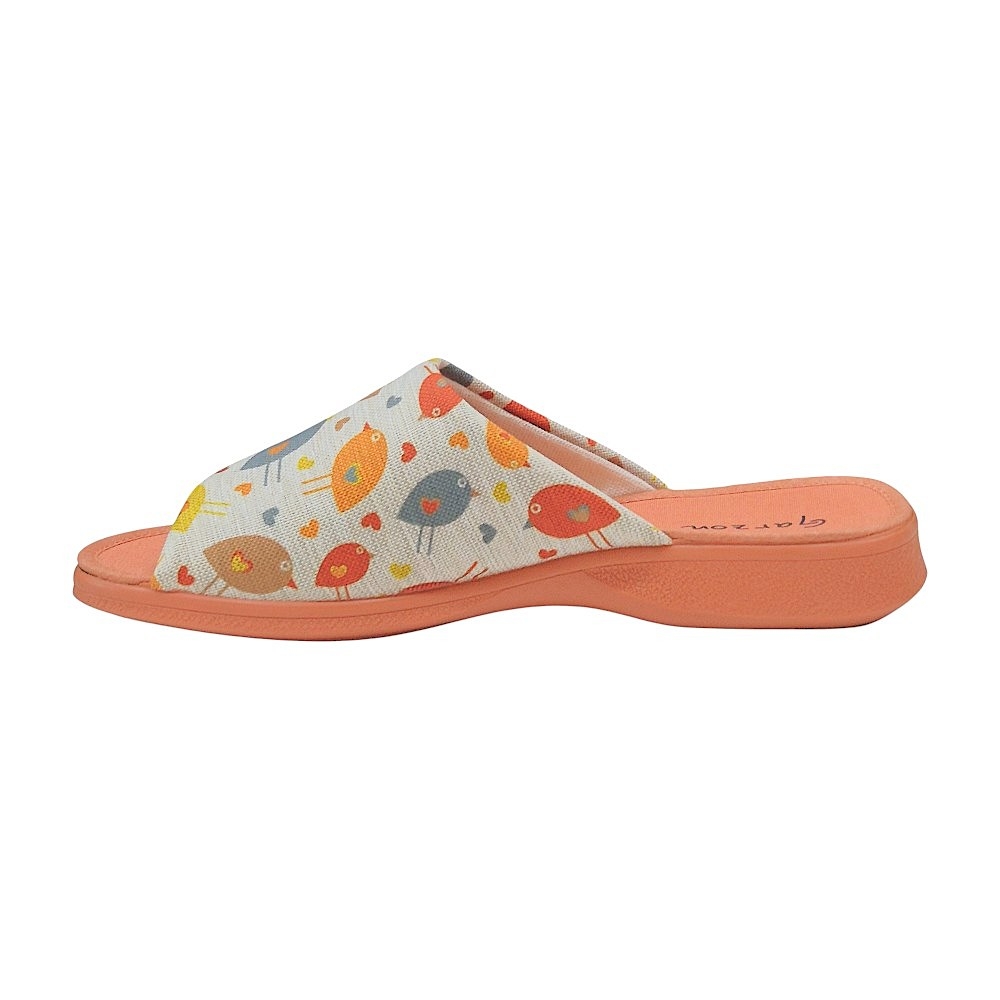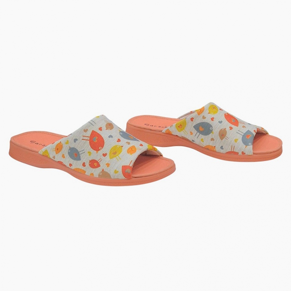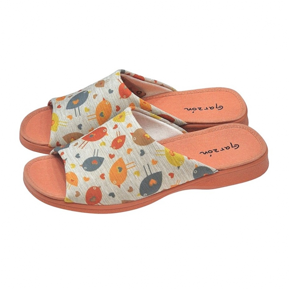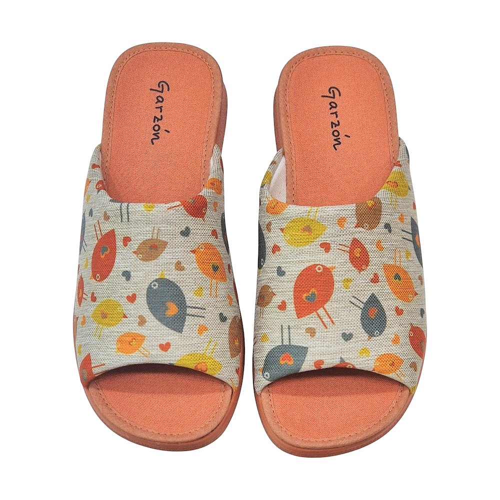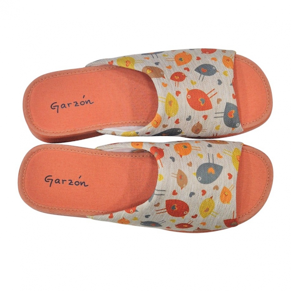 Presentan un encantador estampado de pájaros multicolores sobre una base de tejido técnico con textura similar al lino en tono neutro. Los detalles en color teja (suela, planta y ribetes) aportan una calidez visual única, convirtiéndolas en un accesorio de descanso moderno y femenino.