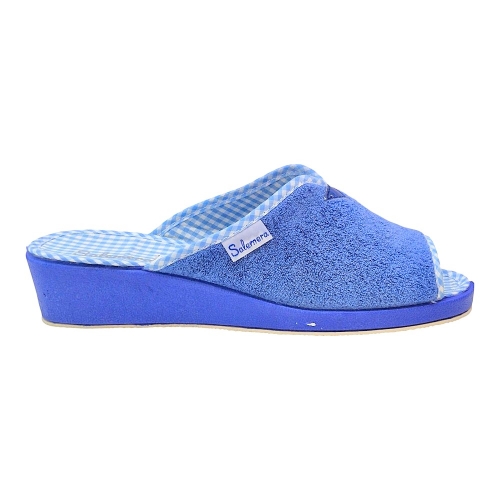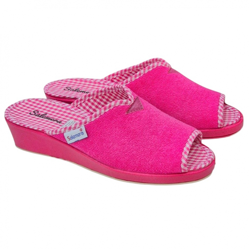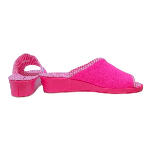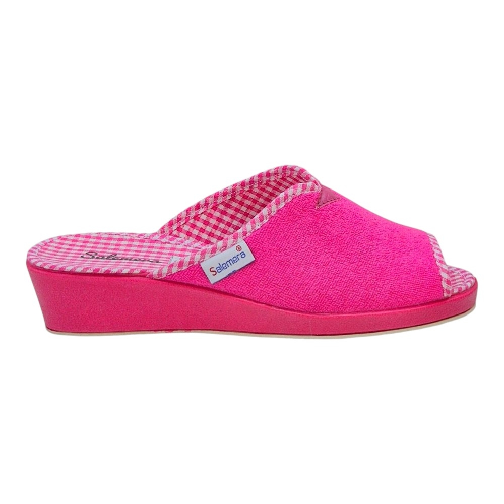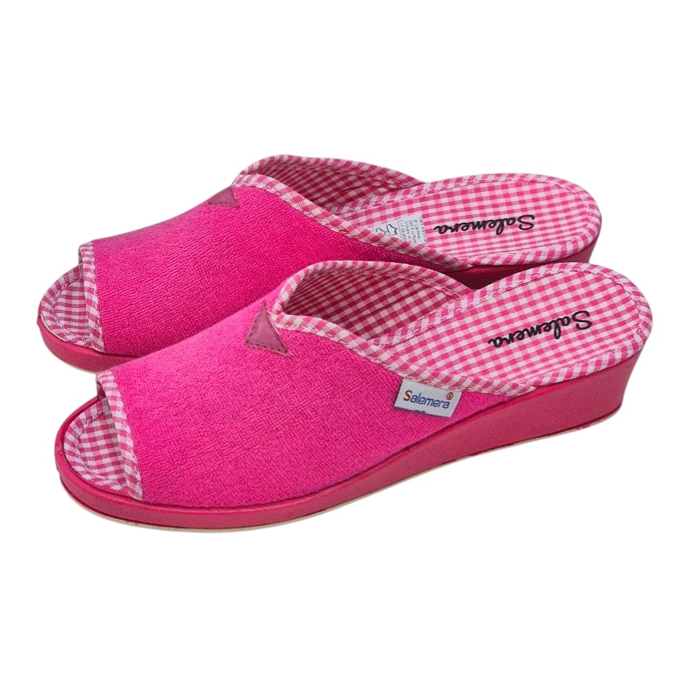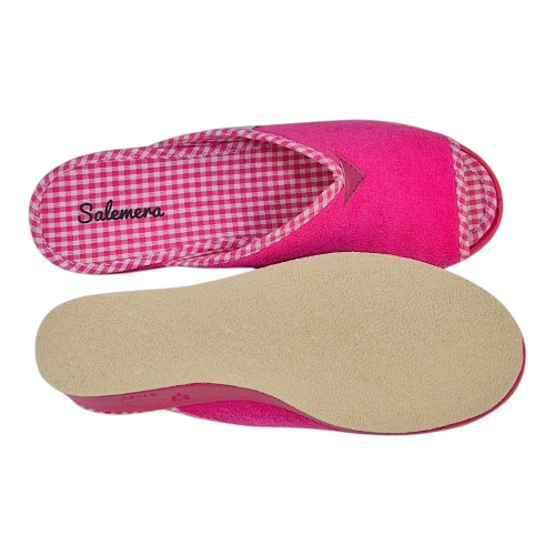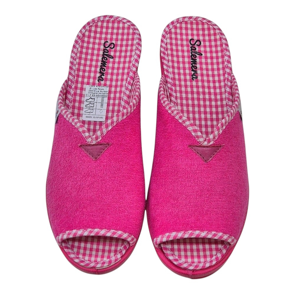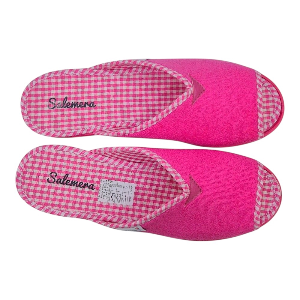 El exterior está confeccionado en un suave tejido de toalla (rizo) de alta calidad, que no solo es agradable al tacto, sino que ayuda a absorber la humedad y mantener el pie seco. El interior sorprende con una plantilla estampada en cuadros vichy en blanco y rosa, aportando un toque retro y chic muy favorecedor.
