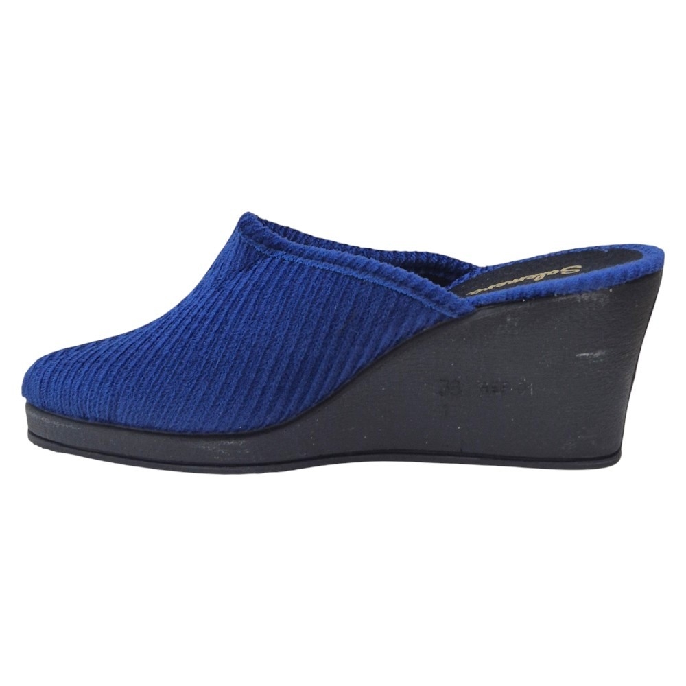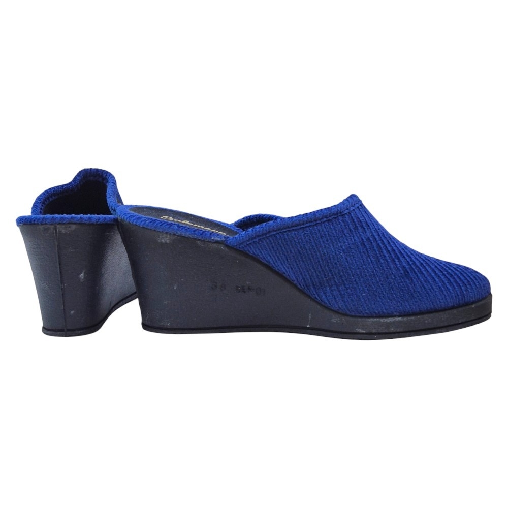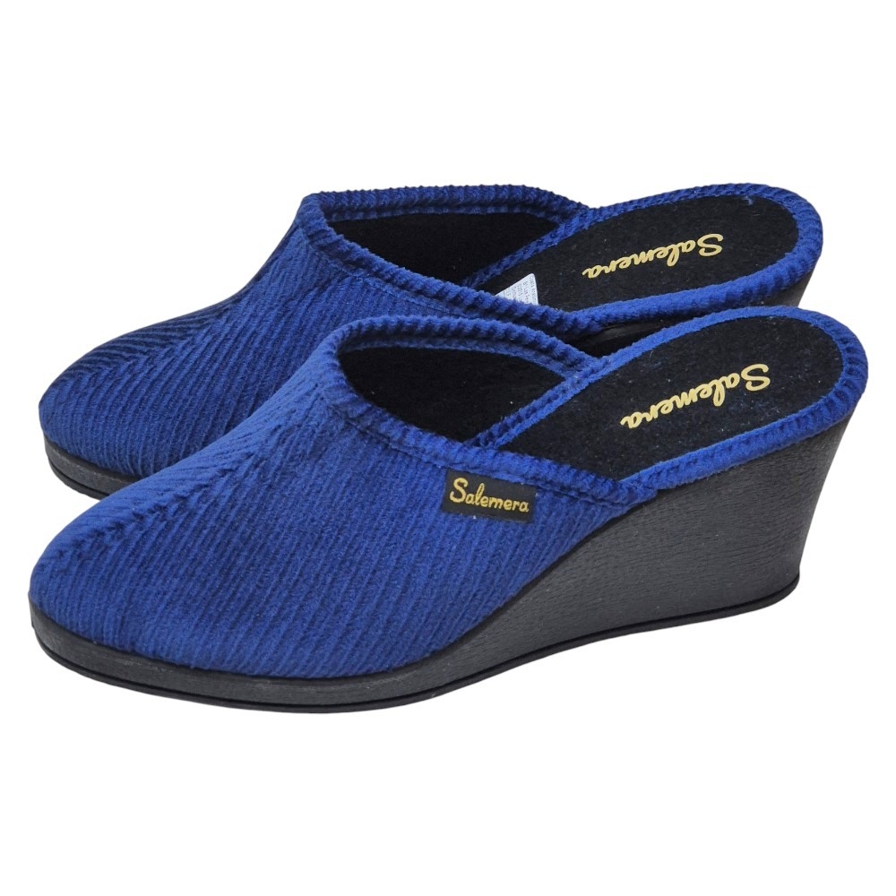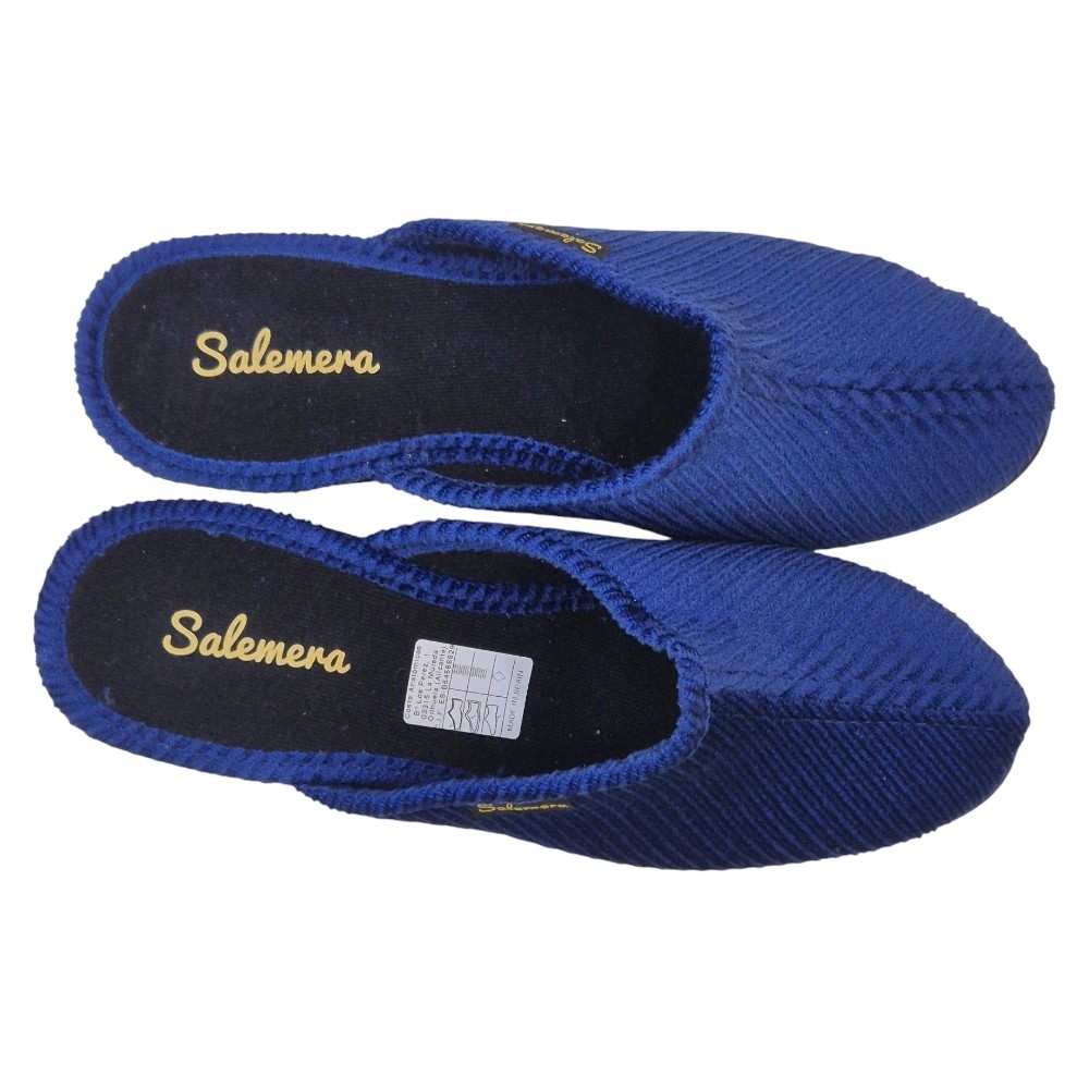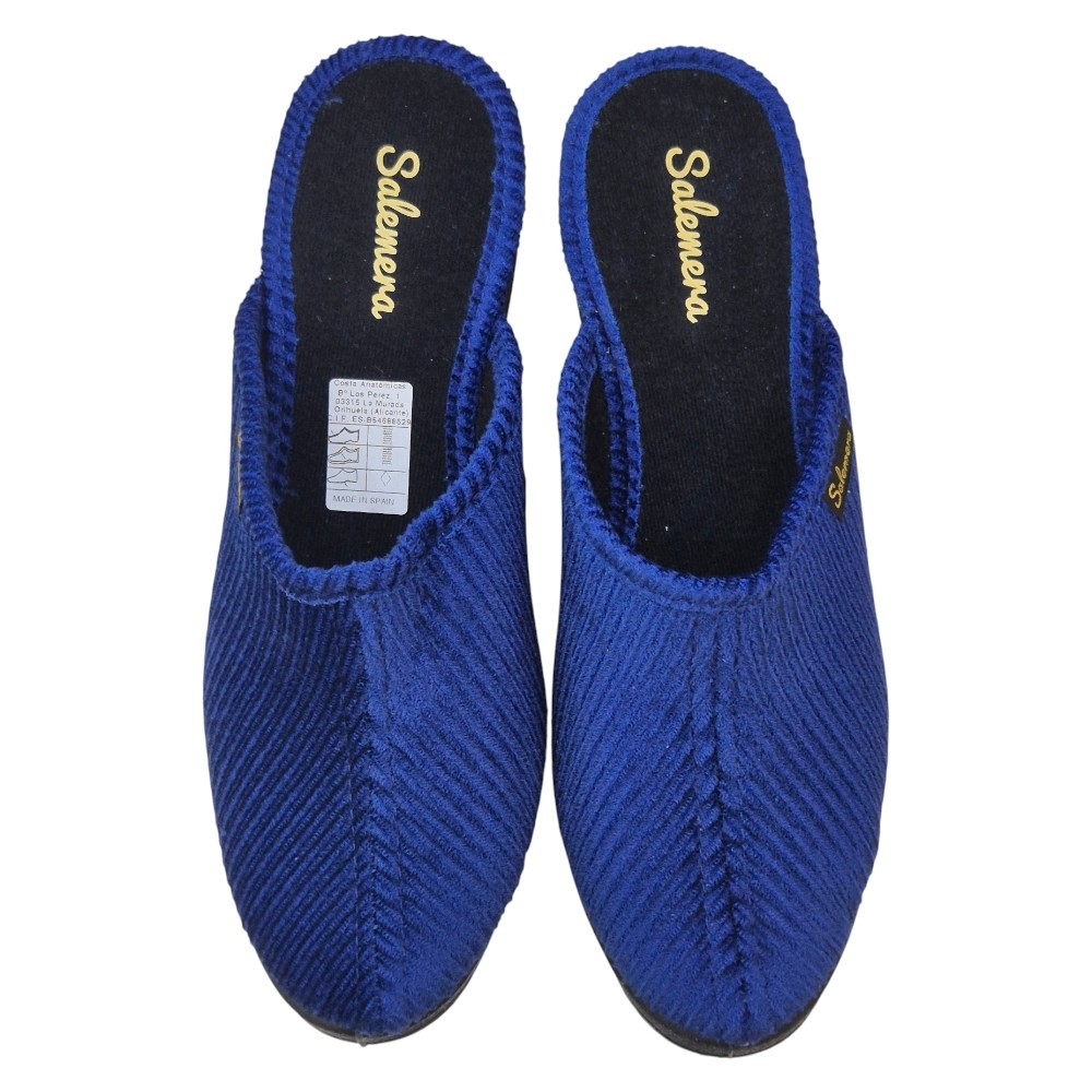 Diseño Clásico y Elegante: Presentan una silueta de zueco o chinela fácil de calzar, ideal para ponerse y quitarse rápidamente. La parte superior está confeccionada en un suave tejido de pana o terciopelo acanalado en un profundo color Marino (azul oscuro), que aporta textura y un aspecto acogedor.