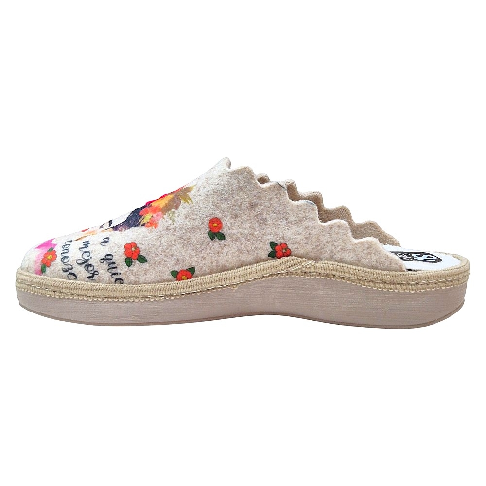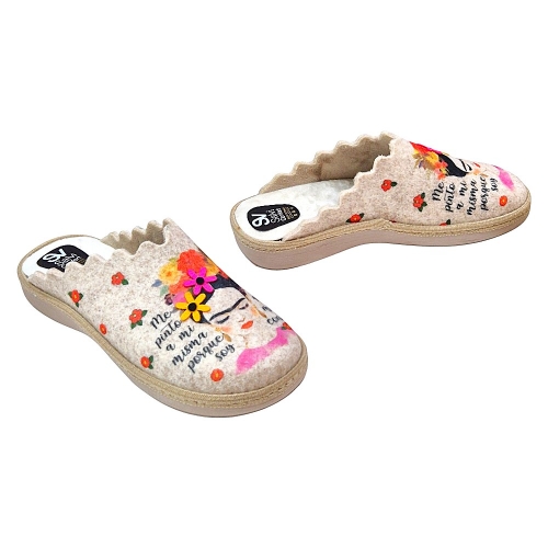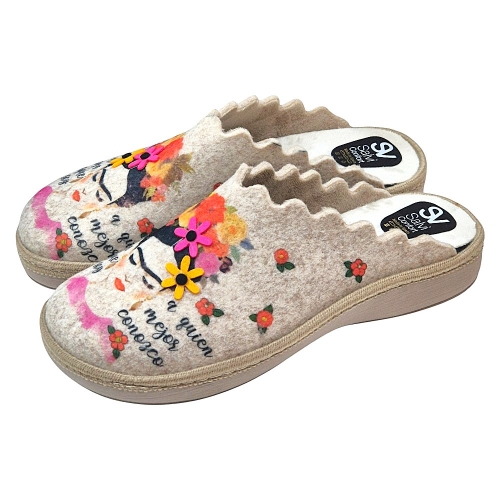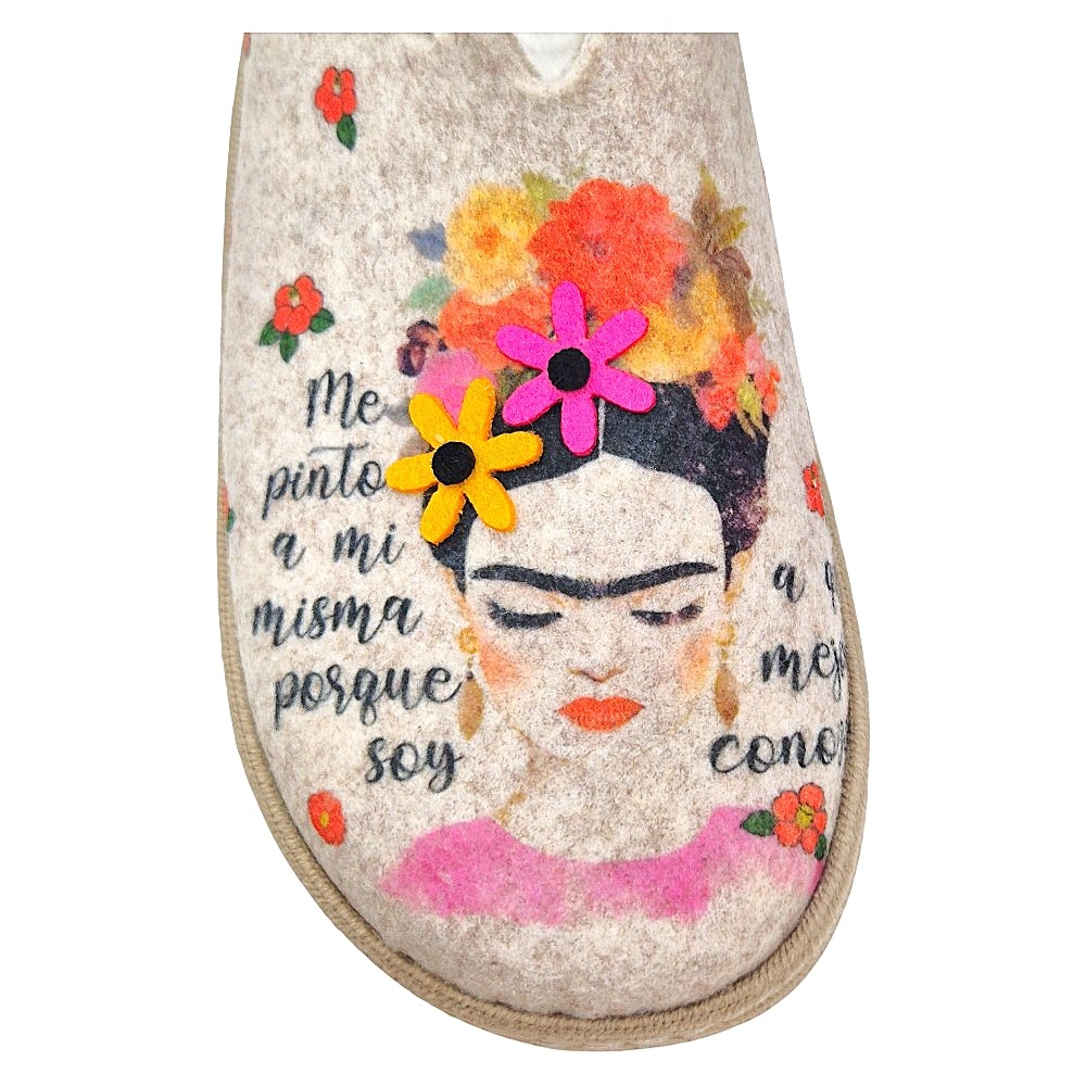 Su atractivo color PET ARENA sirve como lienzo para un vibrante y artístico estampado. El diseño, protagonizado por la icónica figura de Frida Kahlo y la emotiva frase "Me pinto a mí misma porque soy a quien mejor conozco", está rodeado de delicadas flores que aportan un toque de alegría y color. Es una declaración de estilo que celebra la autenticidad y el arte, haciendo de cada paso una experiencia única.