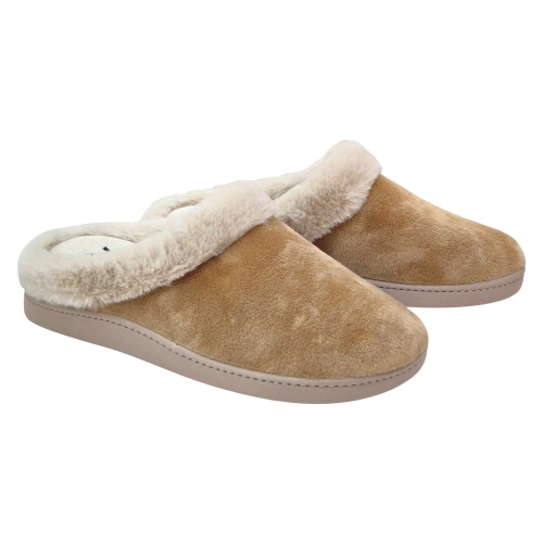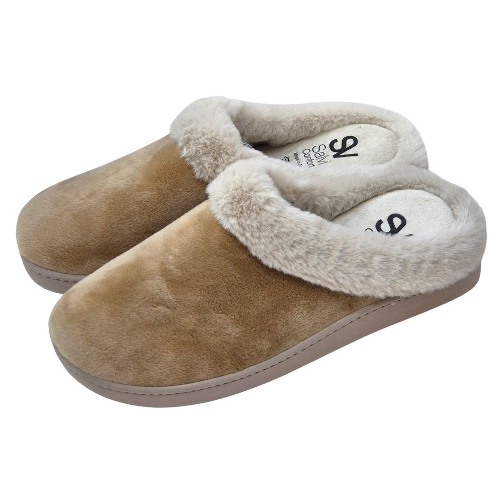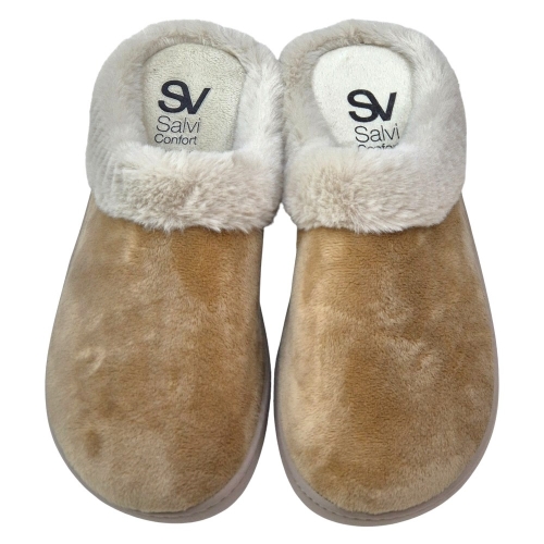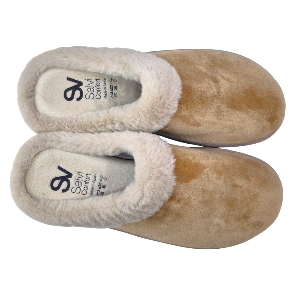 El modelo 57X-056 destaca por la combinación de su tejido principal en Suapel Tostado y el ribete de pelo sintético en un tono más claro que rodea la abertura. Este contraste visual le confiere un aspecto clásico y acogedor. La plantilla lleva grabado el distintivo "SV Salvi Confort", símbolo de la calidad y el diseño especializado de Salvi Calzados. Son la elección perfecta para quienes buscan funcionalidad sin renunciar al estilo y la suavidad.