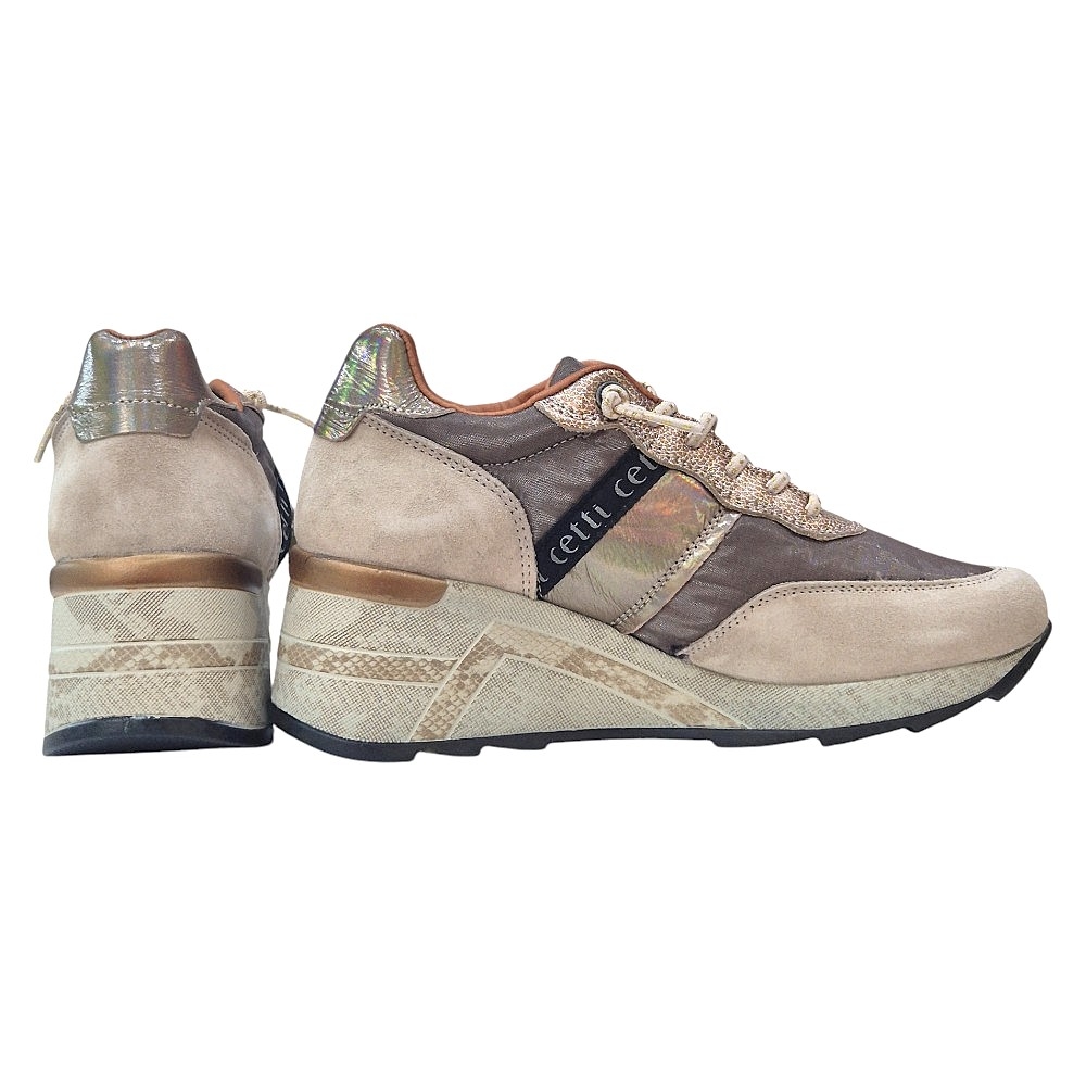 Descubre la combinación perfecta de estilo y comodidad con las zapatillas de cuña Cetti C-1149. Este modelo, en un sofisticado color "Ante-Mesh Dessert", es ideal para la mujer moderna que busca un calzado versátil y a la moda. Su diseño único fusiona la estética deportiva con una elegancia sutil, lo que las hace perfectas para cualquier ocasión, desde un paseo casual hasta una salida con amigas.