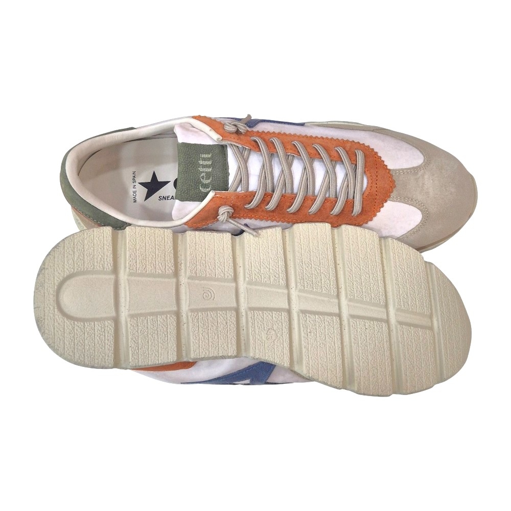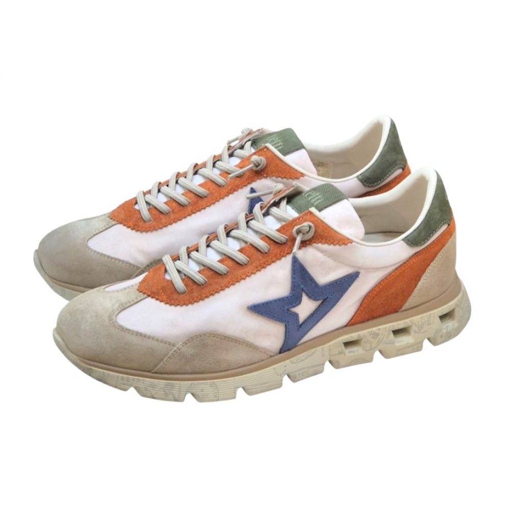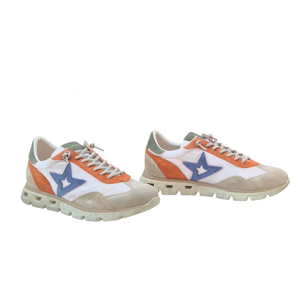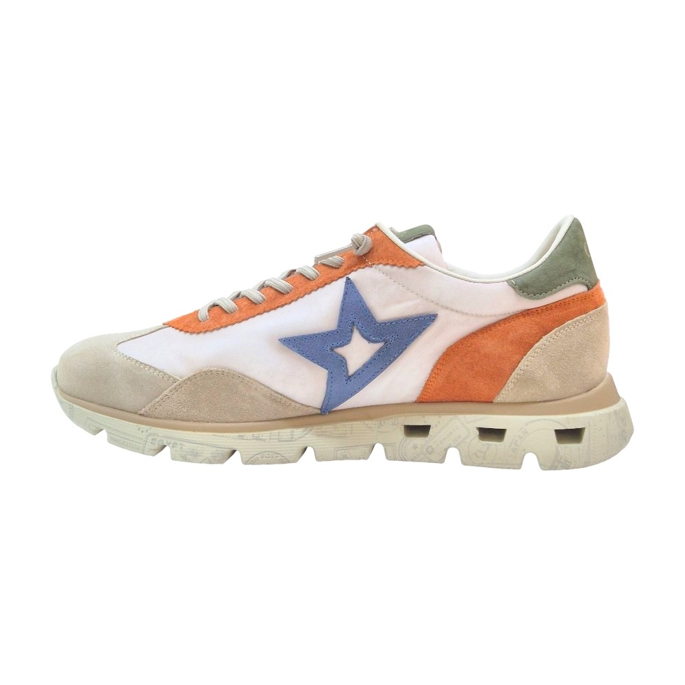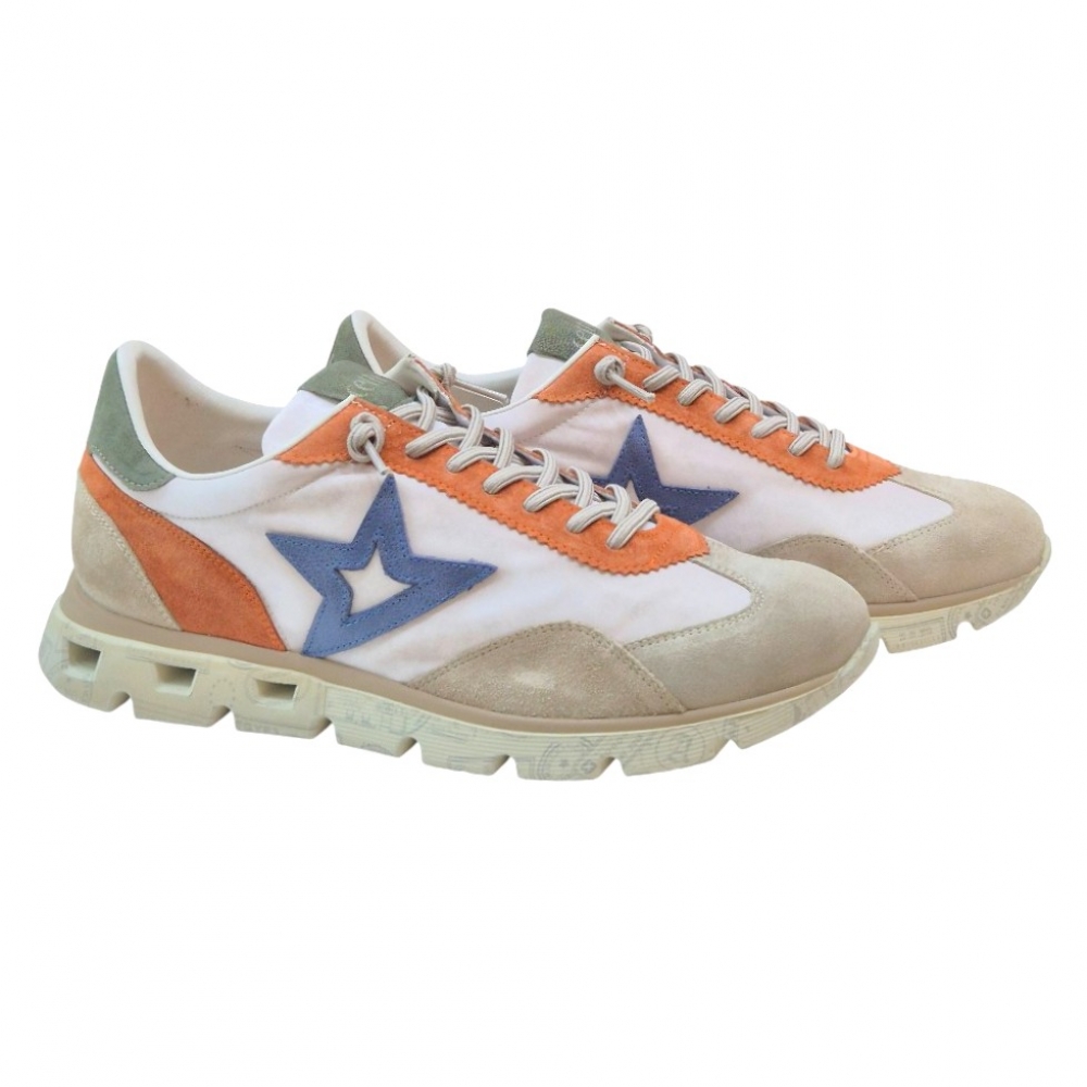 Este modelo presenta una sofisticada paleta de colores tierra y texturas combinadas. La base en tonos crema y arena se ve realzada por detalles en ante naranja vibrante en el talón y los ojales, junto con un toque de verde oliva en la lengüeta y el contrafuerte. El icónico logo de la estrella lateral en color azul denim aporta el contraste perfecto para un look dinámico.