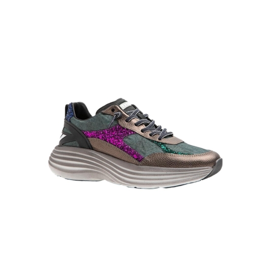 Descubre el estilo y la comodidad con las zapatillas deportivas para mujer de la marca Cetti. Este modelo, diseñado para ofrecer un toque de glamour a tu look casual, destaca por su combinación de colores metálicos y detalles en purpurina púrpura y verde. El diseño vanguardista incluye una parte superior en tonos bronce con acentos brillantes, proporcionando un aspecto moderno y sofisticado.  Conviértete en e