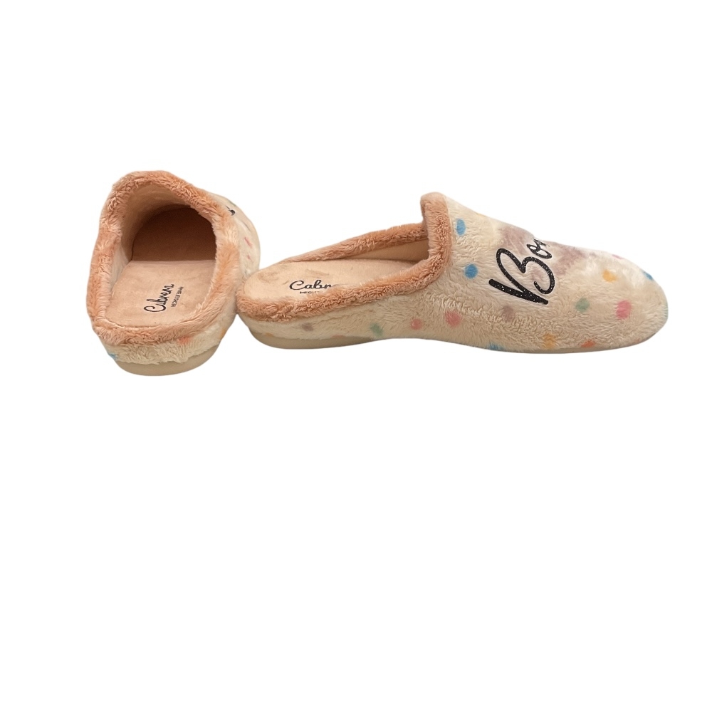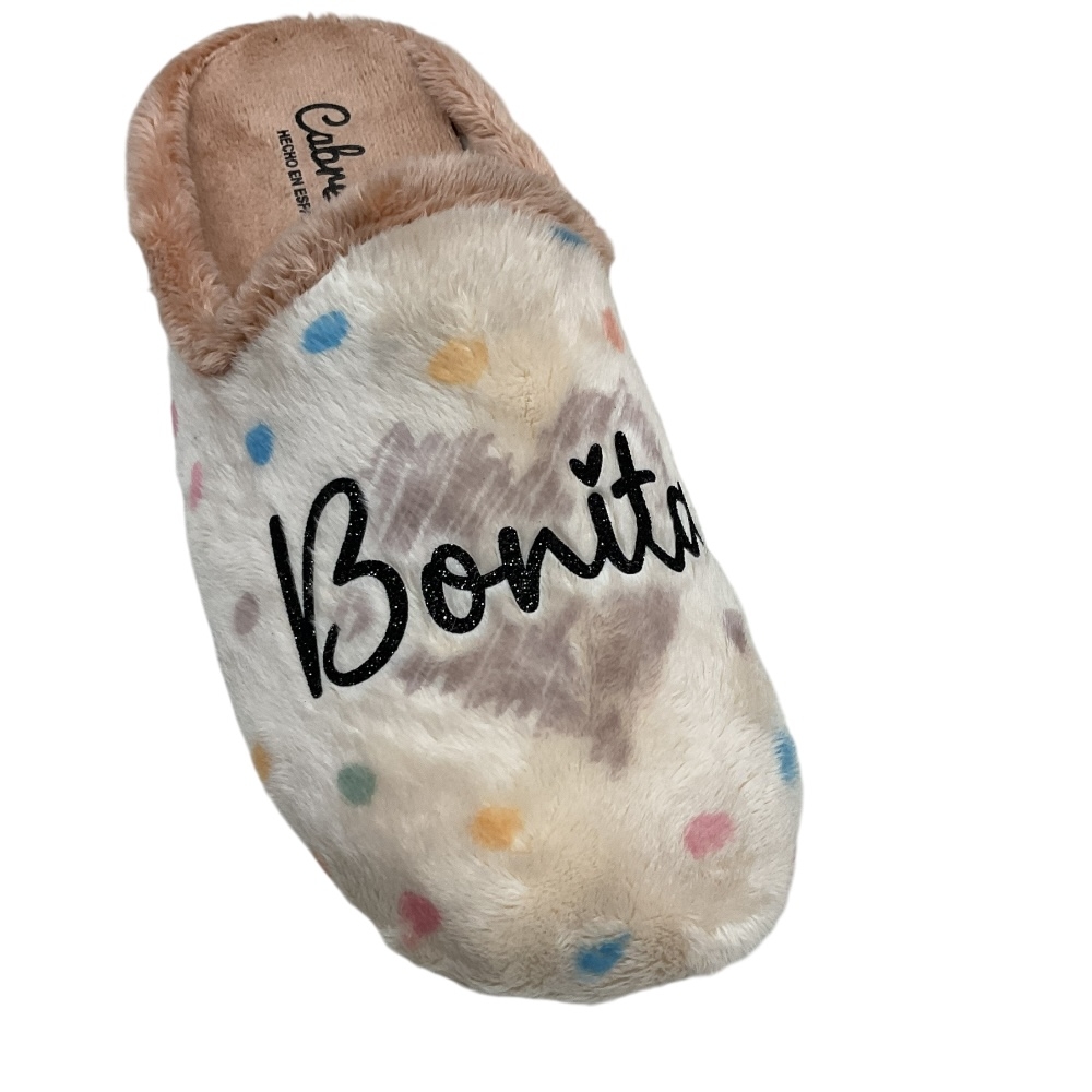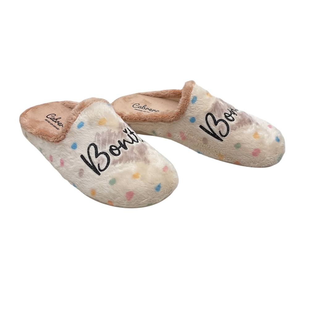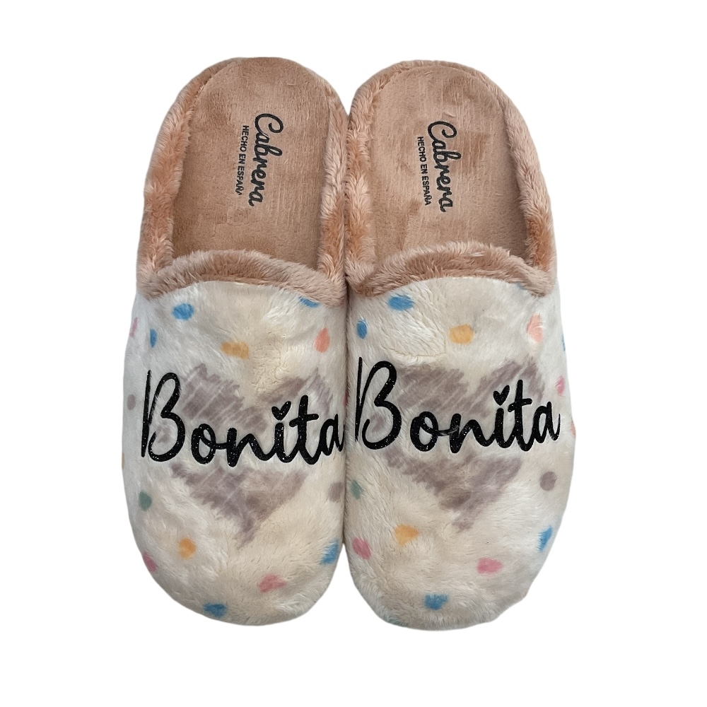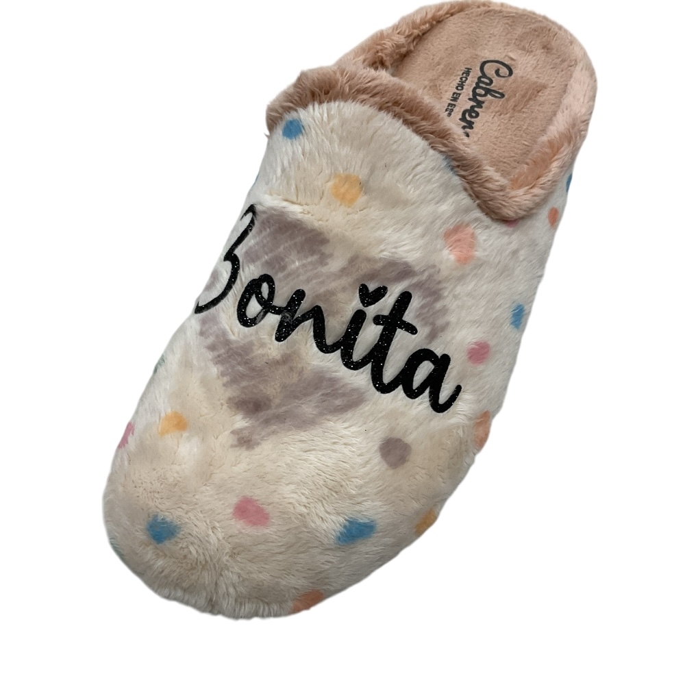 Zapatillas de casa de invierno destalonada con plantilla extraíble, color rosa suave con lunares de colores y un corazón con la palabra BONITA en la pala. Fabricadas en España.