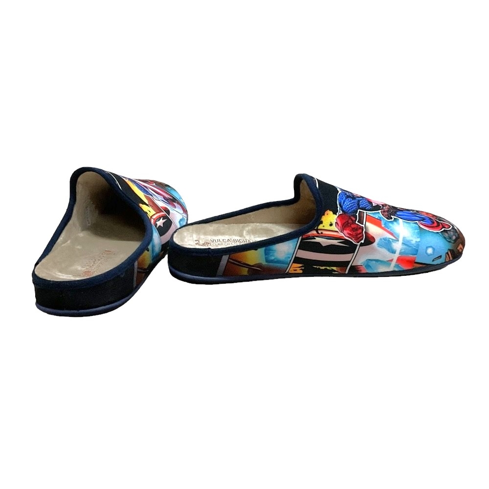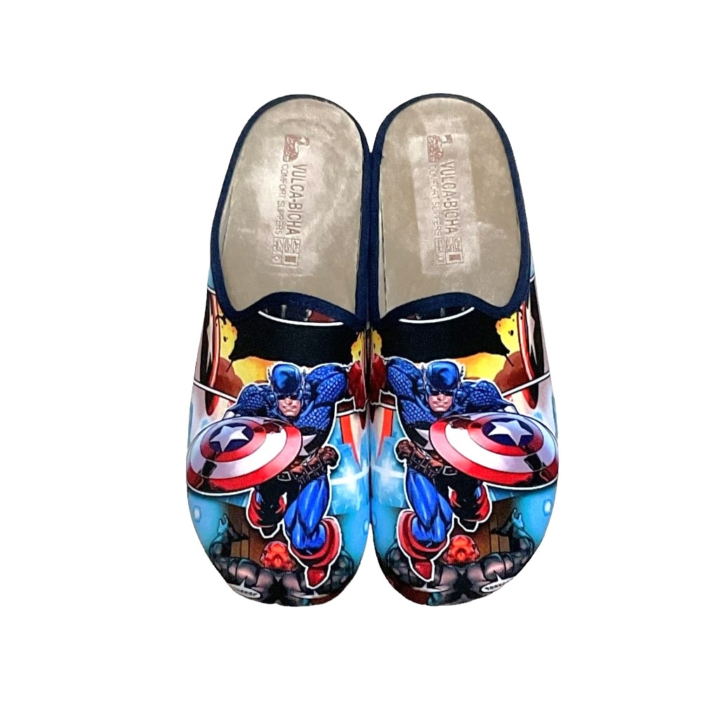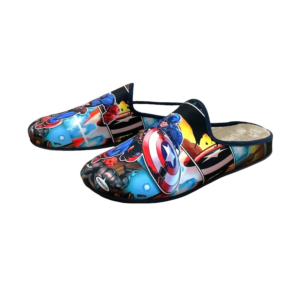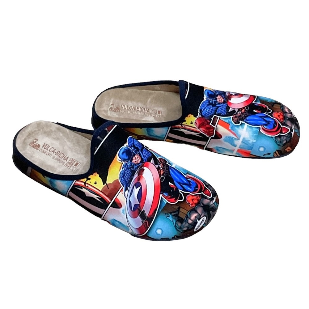Zapatillas de casa inspiradas en el Capitán América, con plantilla extraíble y tejido suave para el invierno, destalonadas y fabricadas en España.