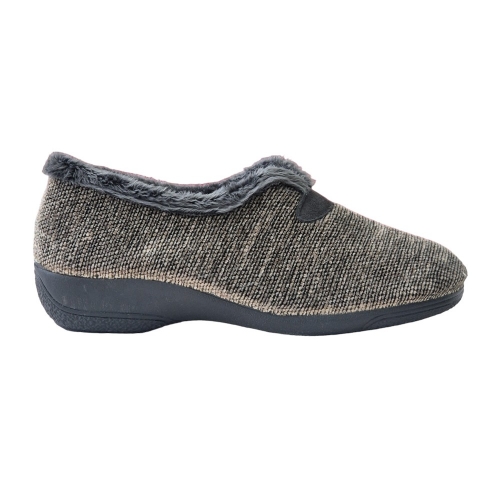 Zapatilla cerrada para el hogar con suela de goma y una cuña de 3,5 cm, interior y borde de pelo suave en color gris. Textil chirub, fabricado en España.