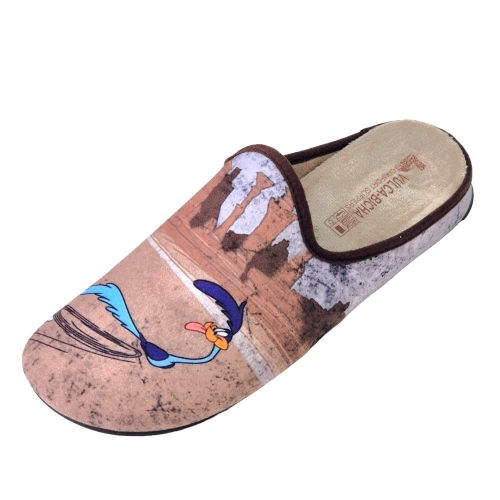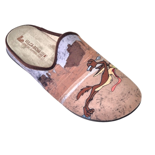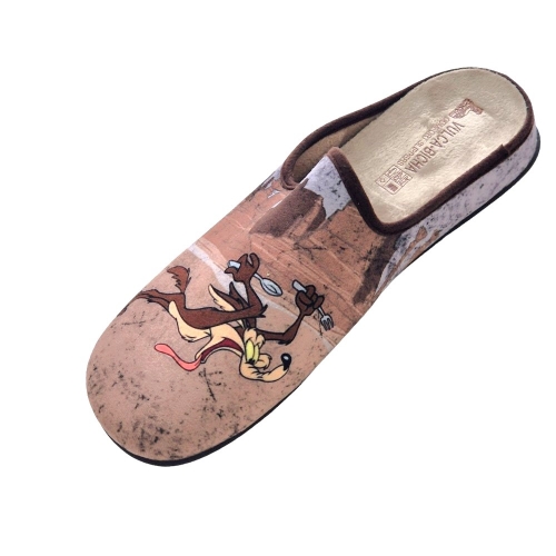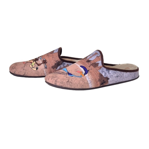 Zapatillas de casa suaves y cómodas, adornadas con la imagen de los dibujos animados Coyote y Correcaminos, planas, con plantillas extraíbles y fabricadas en España.