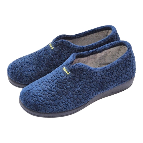 Disfruta del máximo confort en tus momentos de relax con las zapatillas de casa Devalverde para mujer. Este modelo, en un elegante tono azul marino, presenta un diseño de escamas texturizado que añade un toque de sofisticación a tu vestuario de estar por casa.
