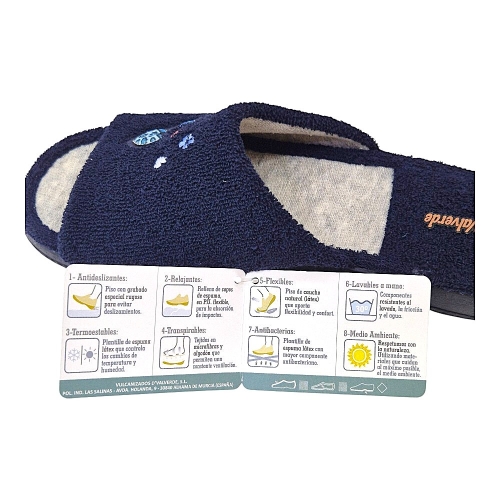 Disfruta del máximo confort en tu hogar con las zapatillas de casa DeValverde modelo 1579, diseñadas para ofrecer una experiencia de suavidad inigualable. Con un elegante color marino, estas pantuflas combinan a la perfección funcionalidad y un toque de alegría en su diseño.