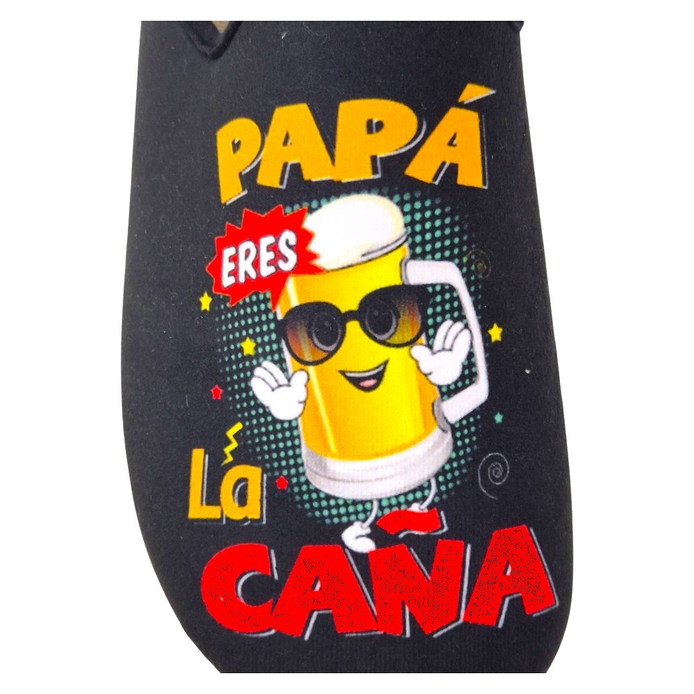 El protagonista de estas zapatillas es su divertido y original estampado. Sobre un fondo negro, destaca un vibrante dibujo de una jarra de cerveza animada, luciendo gafas de sol y con una expresión de alegría. Acompañando la imagen, el texto en mayúsculas "PAPÁ ERES LA CAÑA" en llamativos colores rojo y amarillo, que rinden homenaje a la figura paterna de una manera simpática y entrañable. Este eslogan, popular en España, significa "Papá, eres genial" o "Papá, eres lo más", haciendo de estas zapatillas un regalo con un mensaje lleno de cariño.