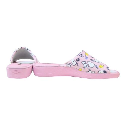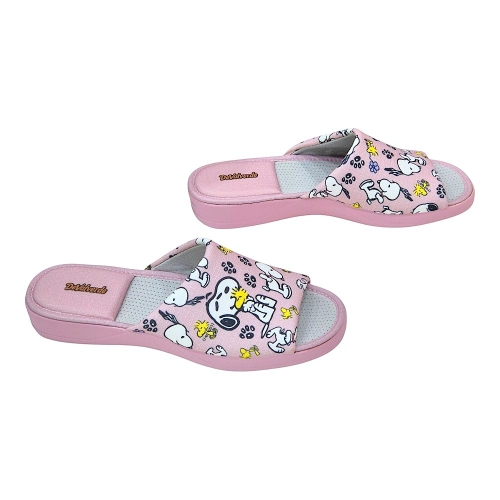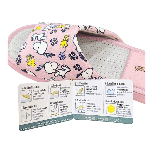Diseño Exclusivo: El color rosado vibrante se complementa con un patrón alegre que presenta a Snoopy, Woodstock y huellas de patitas, añadiendo un toque lúdico y entrañable a tu calzado de casa.