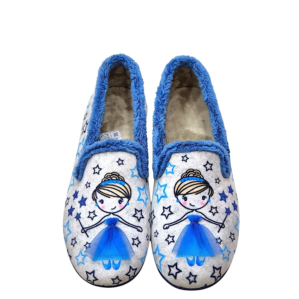 Estampado: El diseño principal destaca por la presencia de dos simpáticas niñas vestidas con trajes de princesa, cada una sosteniendo una varita mágica. Estas figuras están rodeadas de estrellas brillantes, lo que añade un toque mágico y lúdico al calzado.