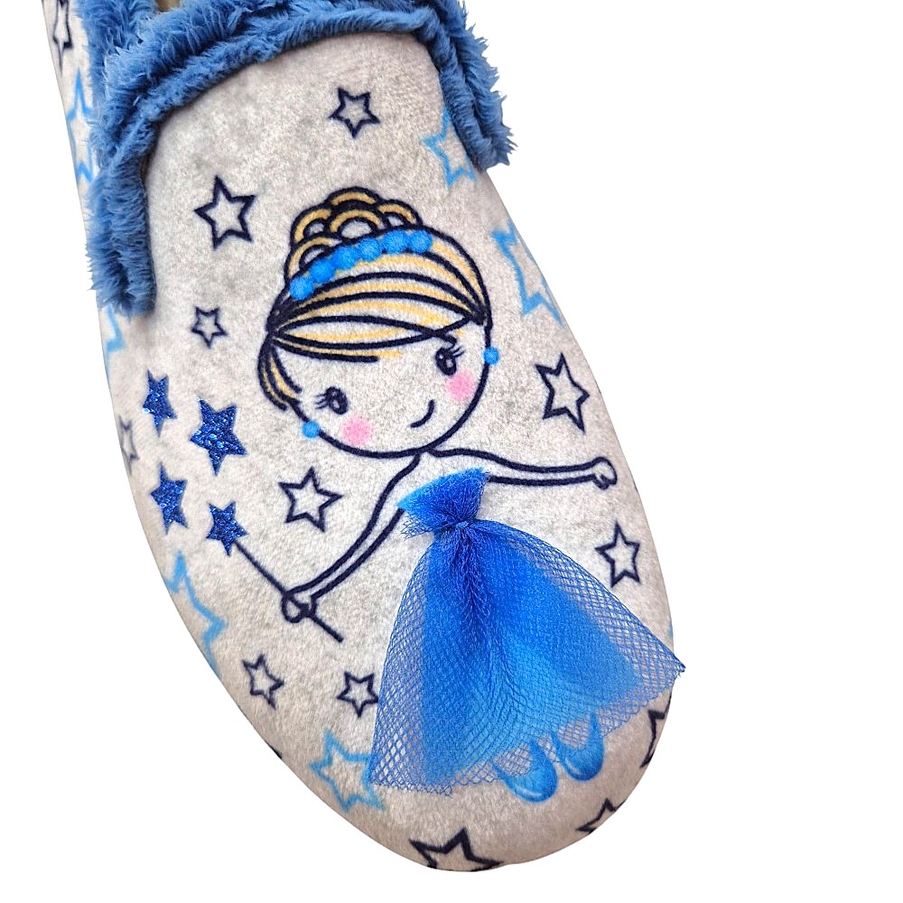 Diseño: Las zapatillas presentan un diseño encantador y femenino, ideal para niñas. El exterior está confeccionado en un tejido suave y cálido, posiblemente de felpa o microfibra, en un tono gris claro.