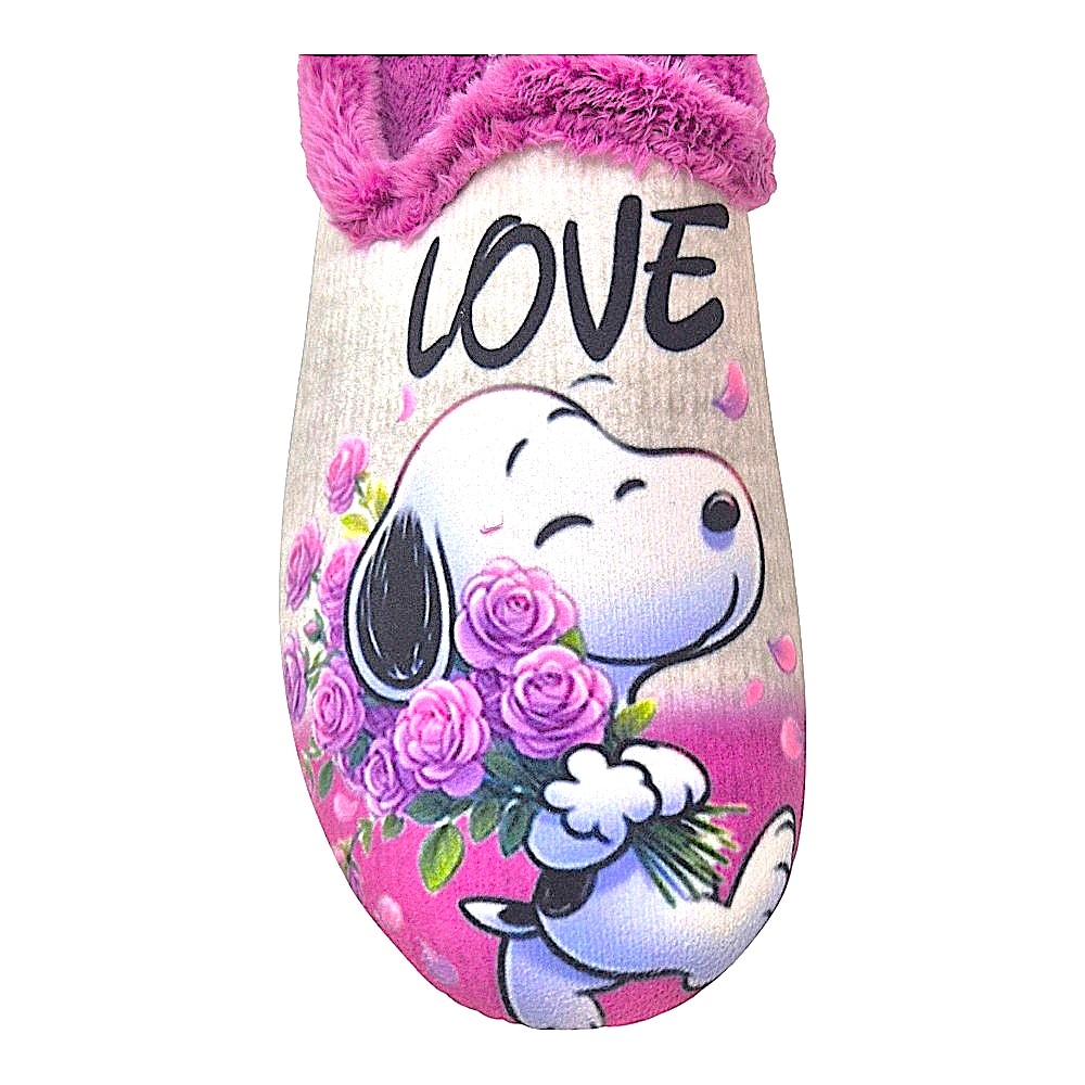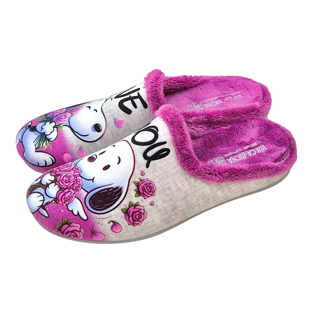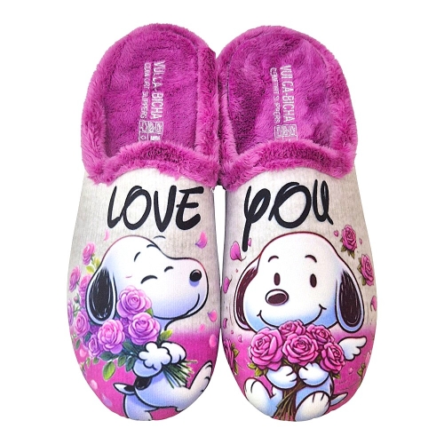 Diseño Exclusivo: Cada zapatilla presenta un adorable estampado de perritos (Snoopy-like) con ramos de rosas y pétalos, transmitiendo ternura y alegría. Una zapatilla lleva la palabra "LOVE" y la otra "YOU", formando un mensaje cariñoso que te encantará ver y sentir.