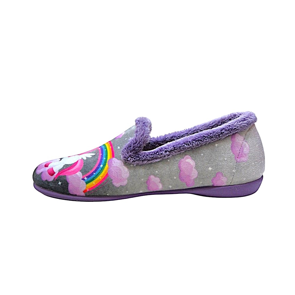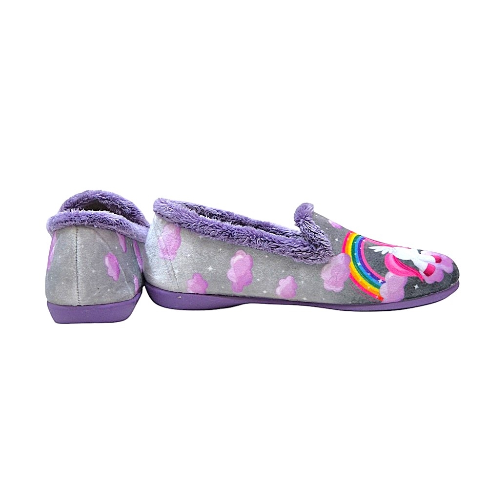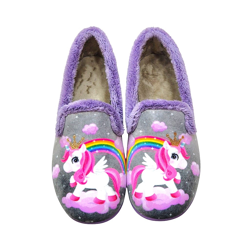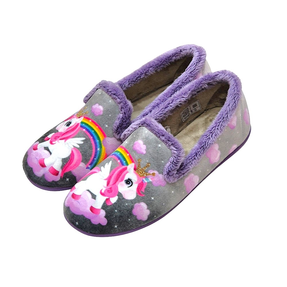 Colores: La combinación de colores es suave y femenina, con predominancia de tonos pastel. El unicornio es de color rosa, el fondo es gris y el borde de las zapatillas es de color morado.