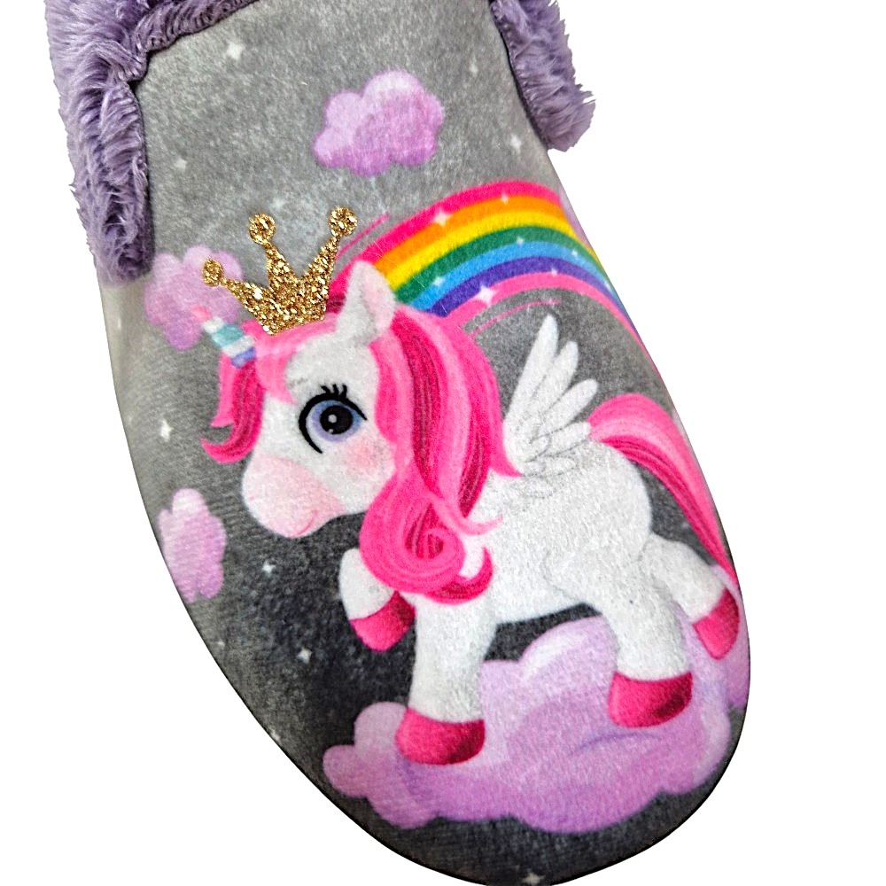 Diseño: Las zapatillas presentan un diseño encantador y mágico, con un unicornio rosa sobre un fondo de nubes y un arcoíris. El unicornio lleva una corona y tiene un cuerno brillante, lo que las hace aún más atractivas para las niñas.