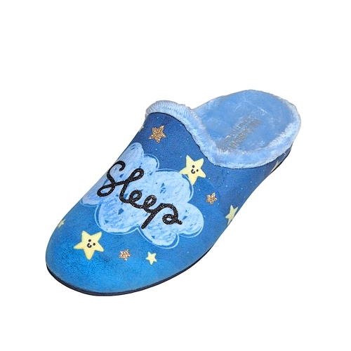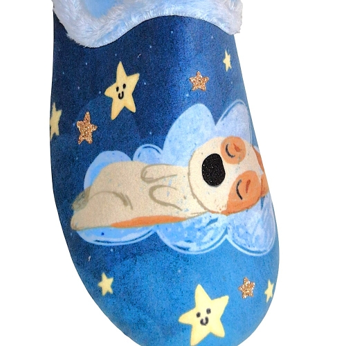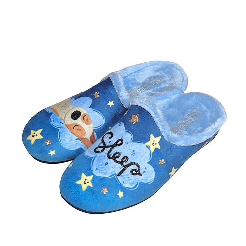 - Diseño: Predomina el color azul con un dibujo de un perrito durmiendo sobre una nube en una zapatilla y la palabra "Sleep" (dormir) escrita con letras brillantes en la otra. Además, hay estrellas doradas dispersas por ambas zapatillas. Este diseño sugiere un estilo dulce e infantil.