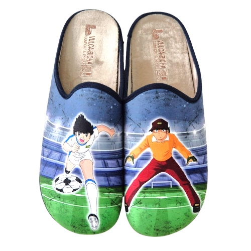 Zapatillas de casa destalonadas con plantilla extraíble y tejido suave para el invierno, decoradas con imágenes de la mítica serie de fútbol Oliver y Benji, fabricadas en España.