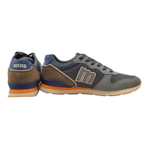 Talón tricolor con detalles en marrón y un vibrante toque naranja en la mediasuela que aporta dinamismo al diseño.