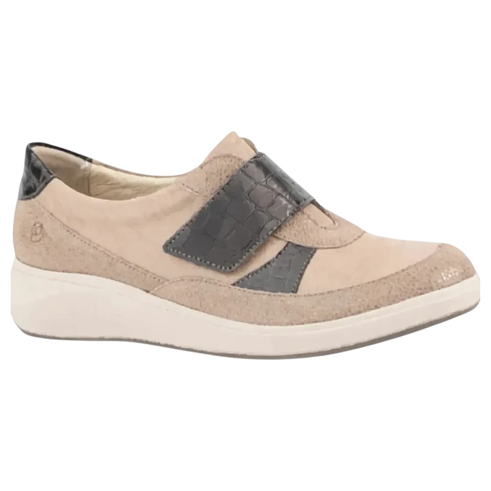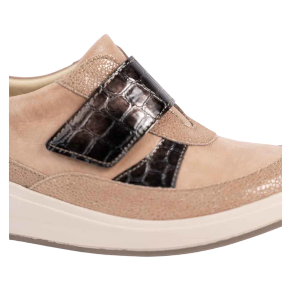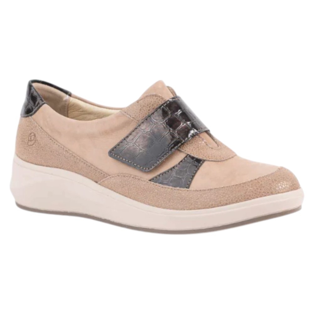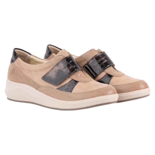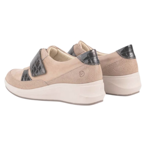 Diseño y materiales: Estas zapatillas de horma ancha están confeccionadas con una exquisita combinación de piel natural en tono beige (TAN SANDY) y detalles en piel efecto reptil coco marrón (ANTRACITA), que añaden un toque de elegancia y sofisticación. El cierre adhesivo proporciona un ajuste seguro y fácil, ideal para quienes buscan practicidad sin renunciar al estilo.