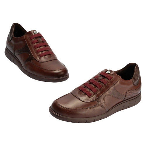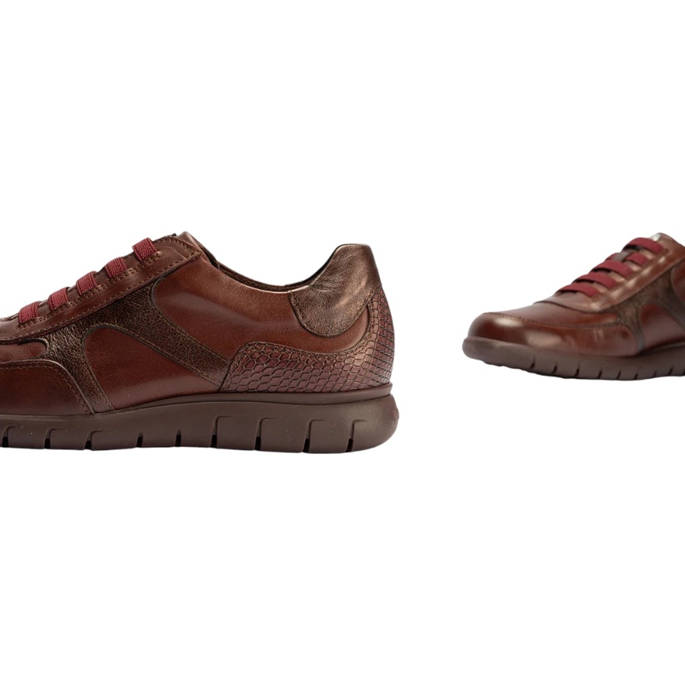 Material Exterior: Confeccionado con piel de alta calidad en un atractivo color burdeos. Presenta una combinación de texturas, incluyendo un detalle en la talonera con un sutil relieve tipo cocodrilo o escama que le aporta un toque sofisticado y moderno.