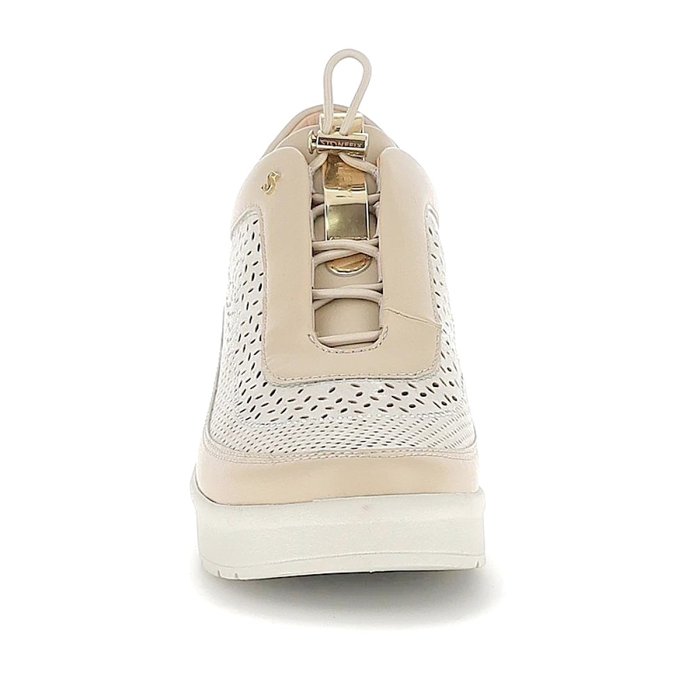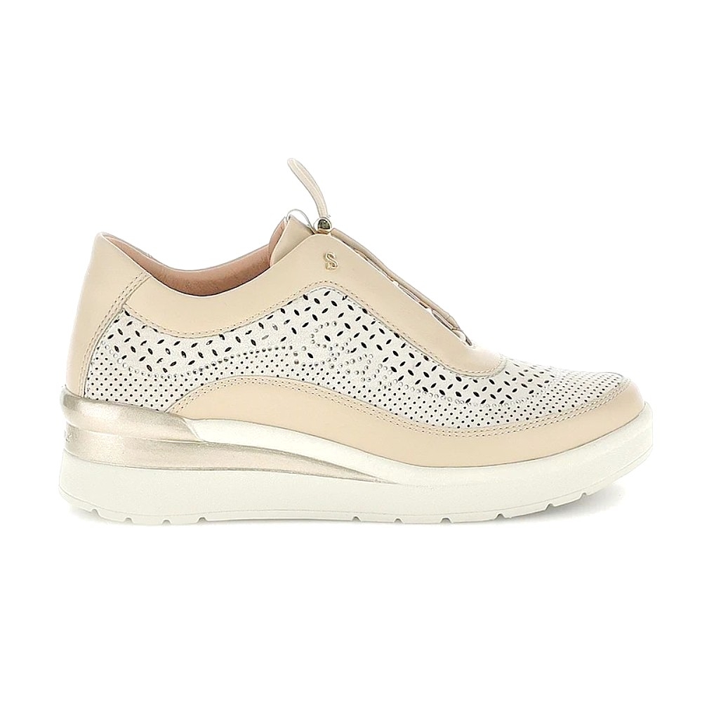 Acabado Láser y Strass: El corte de la zapatilla presenta un intrincado diseño perforado con tecnología láser que favorece la transpiración, adornado con sutiles detalles de strass que aportan un brillo sofisticado y femenino sin perder la discreción.