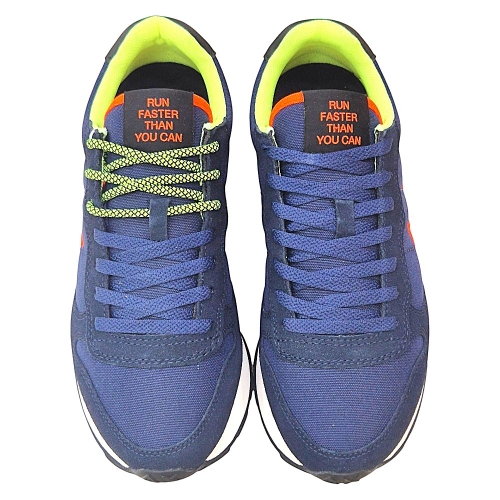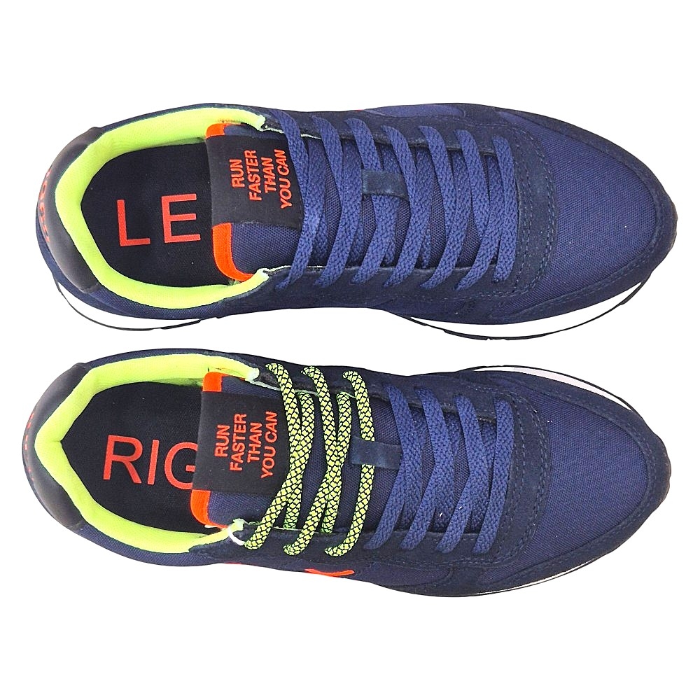 Las zapatillas presentan llamativos detalles en color flúor que añaden un toque de color y personalidad. El icónico logotipo de Sun68, un dinámico triángulo y una cruz en color rojo, destaca en el lateral del calzado. Los cordones de un vibrante color verde neón contrastan audazmente con la parte superior en azul marino, mientras que la lengüeta de color naranja flúor realza aún más la estética enérgica de la zapatilla. La lengüeta también presenta el motivador eslogan, "RUN FASTER THAN YOU CAN" (Corre más rápido de lo que puedes), en texto negro.