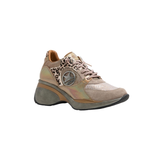 Zapatilla casual CETTI original en tonos tierra con variedad de pieles: serraje en puntera y mitad de cordonera, metalizado en laterales, parte trasera y logo en lengüeta, textil en laterales y lengüeta, y estampado de leopardo en cordonera lateral y trasera, con serpiente dorada en la pala. Luce un adorno metálico del logo en el lateral exterior. Su plantilla de piel acolchada y extraíble ofrece gran comodidad. Cuenta con una suela de semicuña deportiva de 6 cm y está fabricada en España.