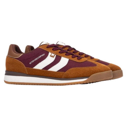 Fabricadas con un material sintético de alta calidad que imita la piel, estas zapatillas destacan por su durabilidad y su diseño sofisticado. La combinación de tonos camel y burdeos, junto con las franjas blancas laterales, les confiere un aire retro y deportivo a la vez.