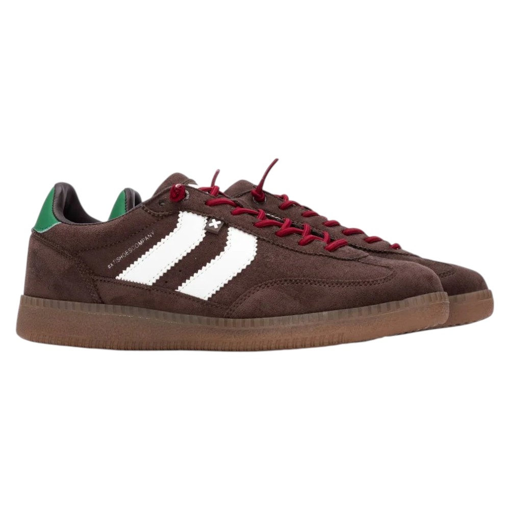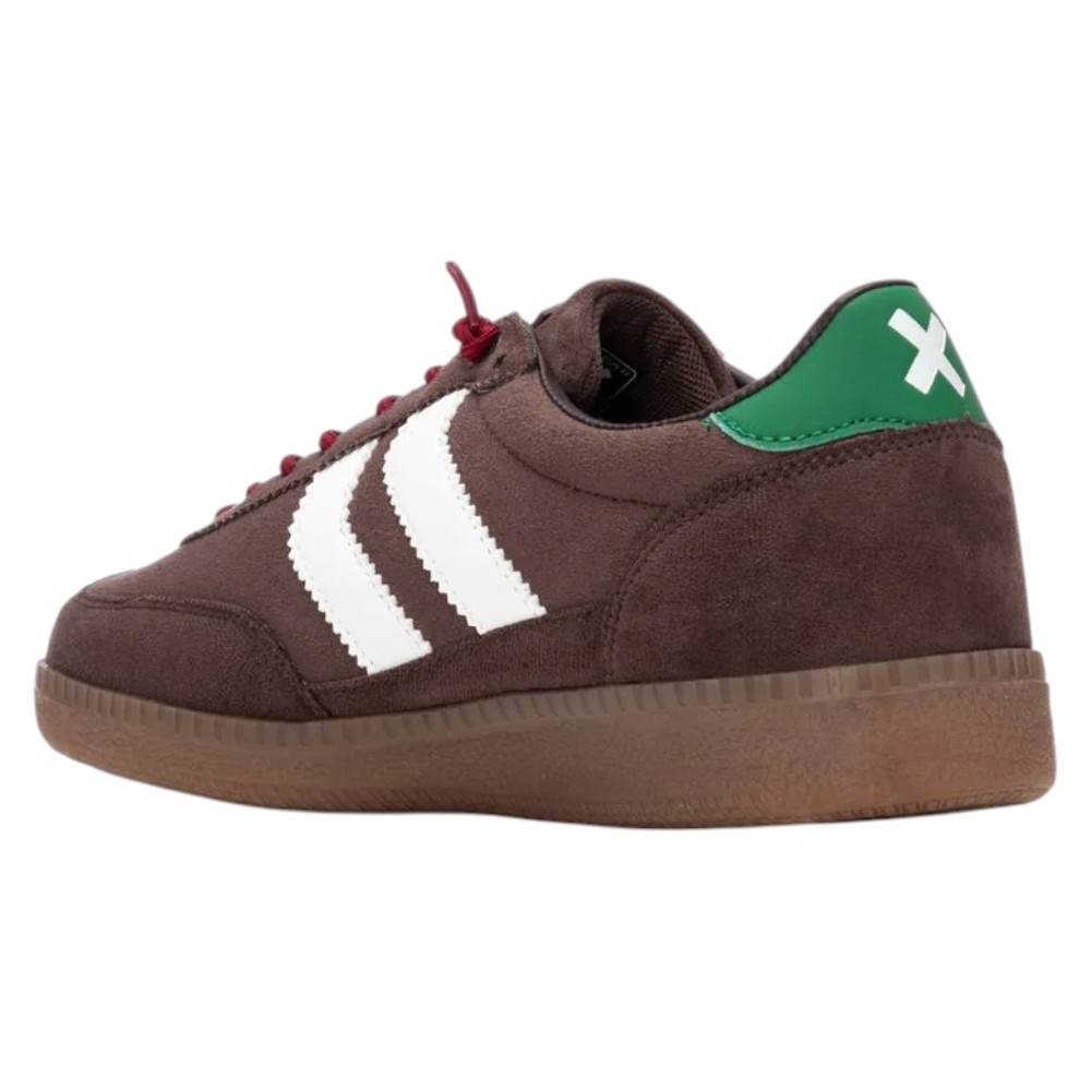 Diseño moderno y versátil: Su silueta de inspiración deportiva, combinada con el color marrón clásico y los detalles en contraste (rayas blancas laterales, cordones burdeos y contrafuerte verde), ofrece un look versátil que complementa a la perfección tanto jeans como pantalones chinos.