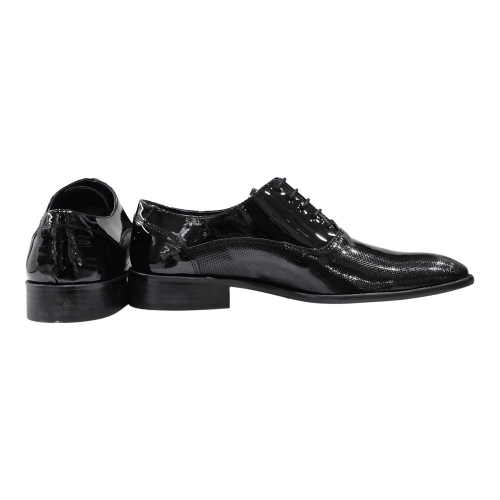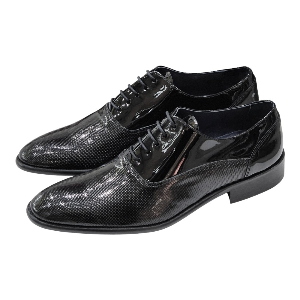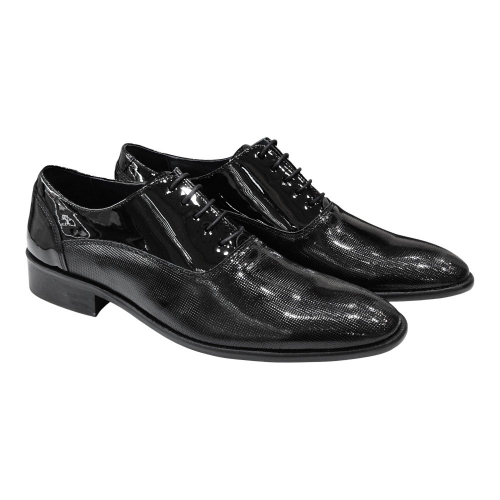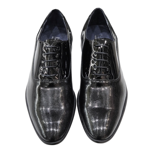Este modelo destaca por su sofisticado juego de contrastes. Combina la sobriedad del charol negro de alto brillo en el empeine y el talón con un exquisito grabado micro-texturizado en la puntera y los laterales. Esta mezcla de acabados aporta una profundidad visual única que captura la luz de forma distinta en cada paso.