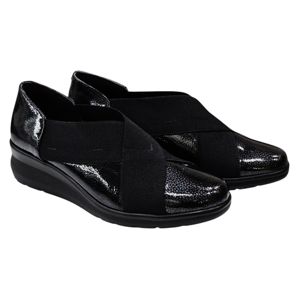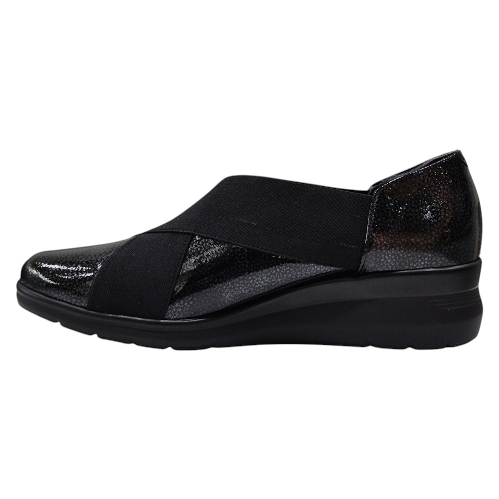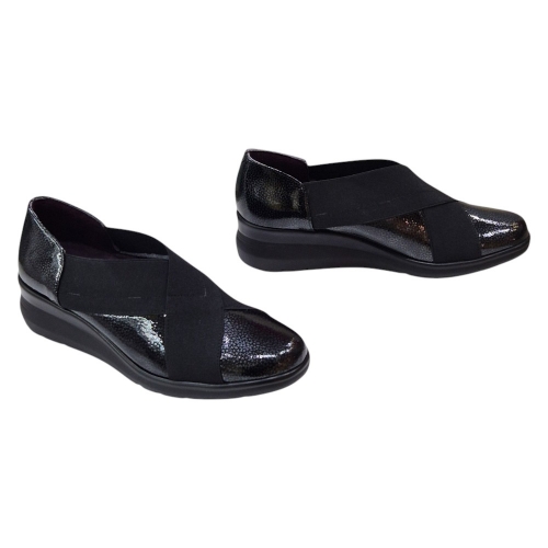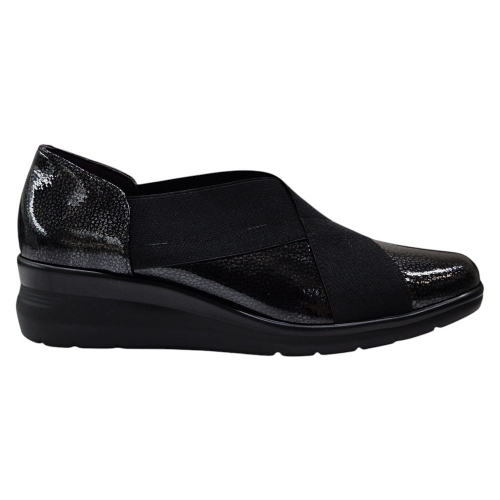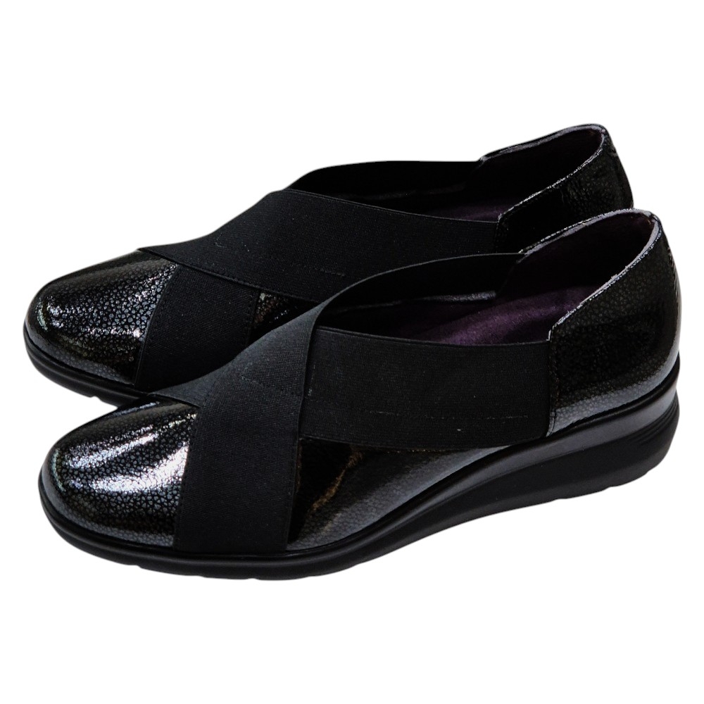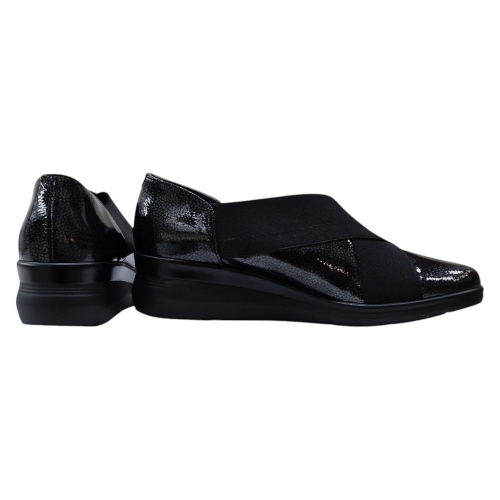 Este zapato cerrado presenta un diseño de mocasín moderno montado sobre una cómoda cuña. El exterior está confeccionado con piel charol de alta calidad en color negro, que le confiere un brillo elegante y duradero. La puntera y el talón destacan por un sutil y sofisticado grabado tipo fantasía o reptil que añade una rica textura visual al zapato.