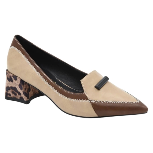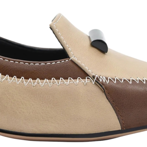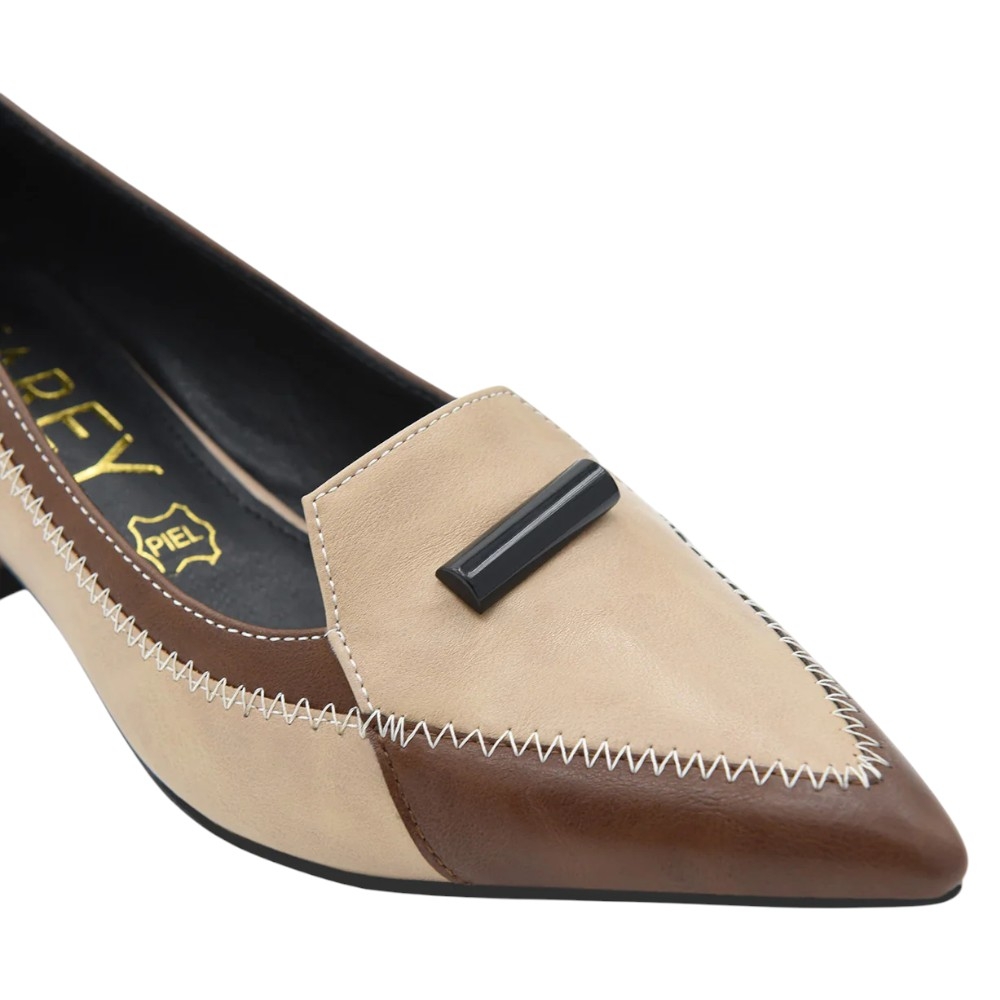 El zapato está confeccionado en material sintético de alta calidad con efecto piel, presentando un elegante diseño bicolor en tonos marrón y beige. La puntera afilada, en tono marrón, no solo aporta un aire de refinamiento, sino que también contribuye a estilizar la figura del pie.