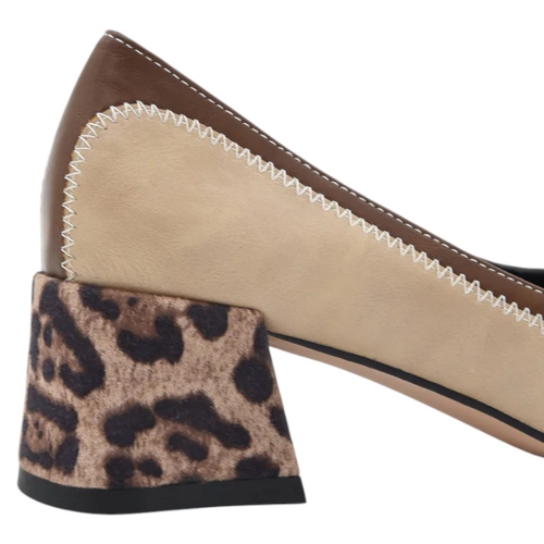 Tacón: El elemento protagonista es el tacón medio y ancho (tipo cuadrado), forrado con un vibrante estampado de leopardo (animal print). Este detalle audaz inyecta un toque moderno y salvaje, ideal para transformar cualquier atuendo.