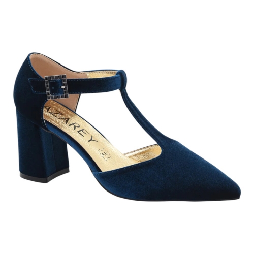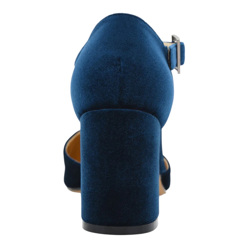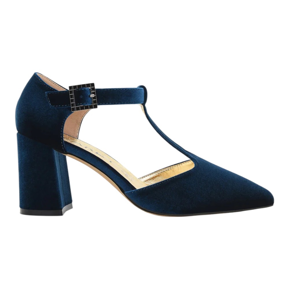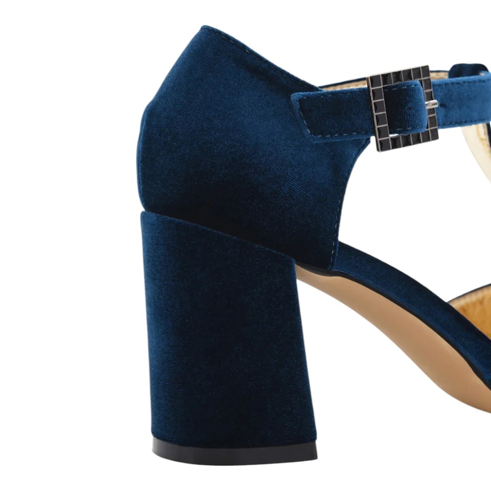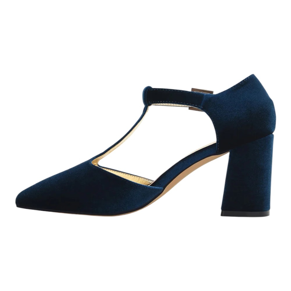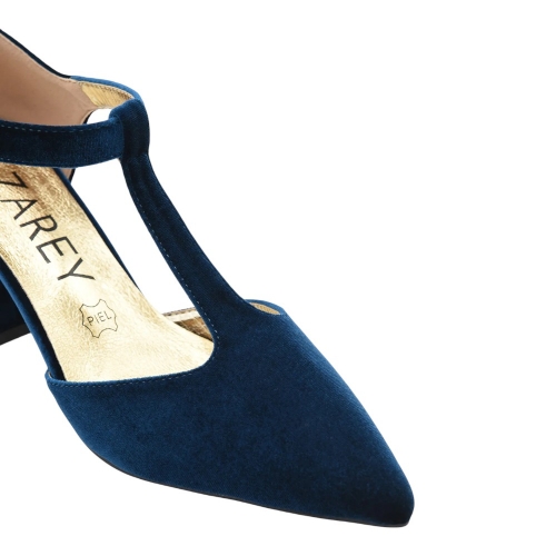 Elaborado en un suntuoso terciopelo azul, este zapato aporta una textura rica y un color vibrante que eleva instantáneamente cualquier conjunto. Su distintivo diseño en 'T' (pulsera en forma de T) no solo ofrece un toque vintage elegante, sino que también garantiza un ajuste seguro y favorecedor al pie.