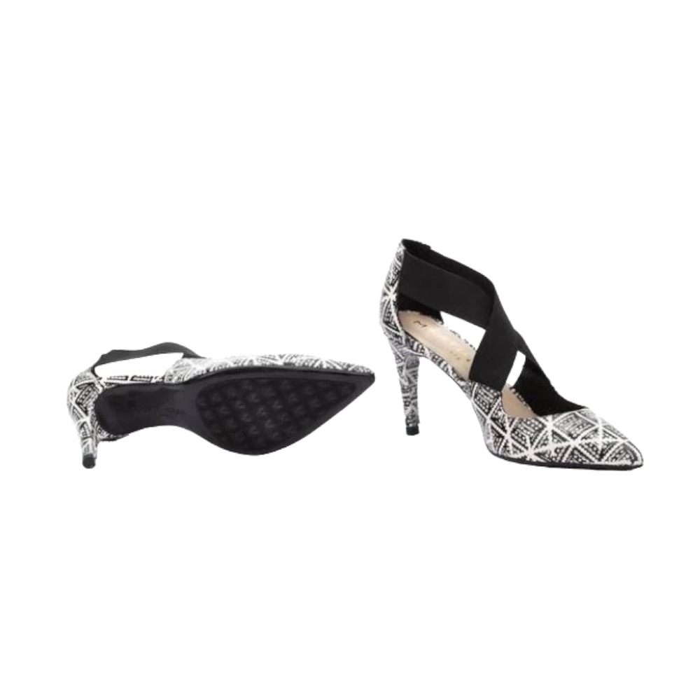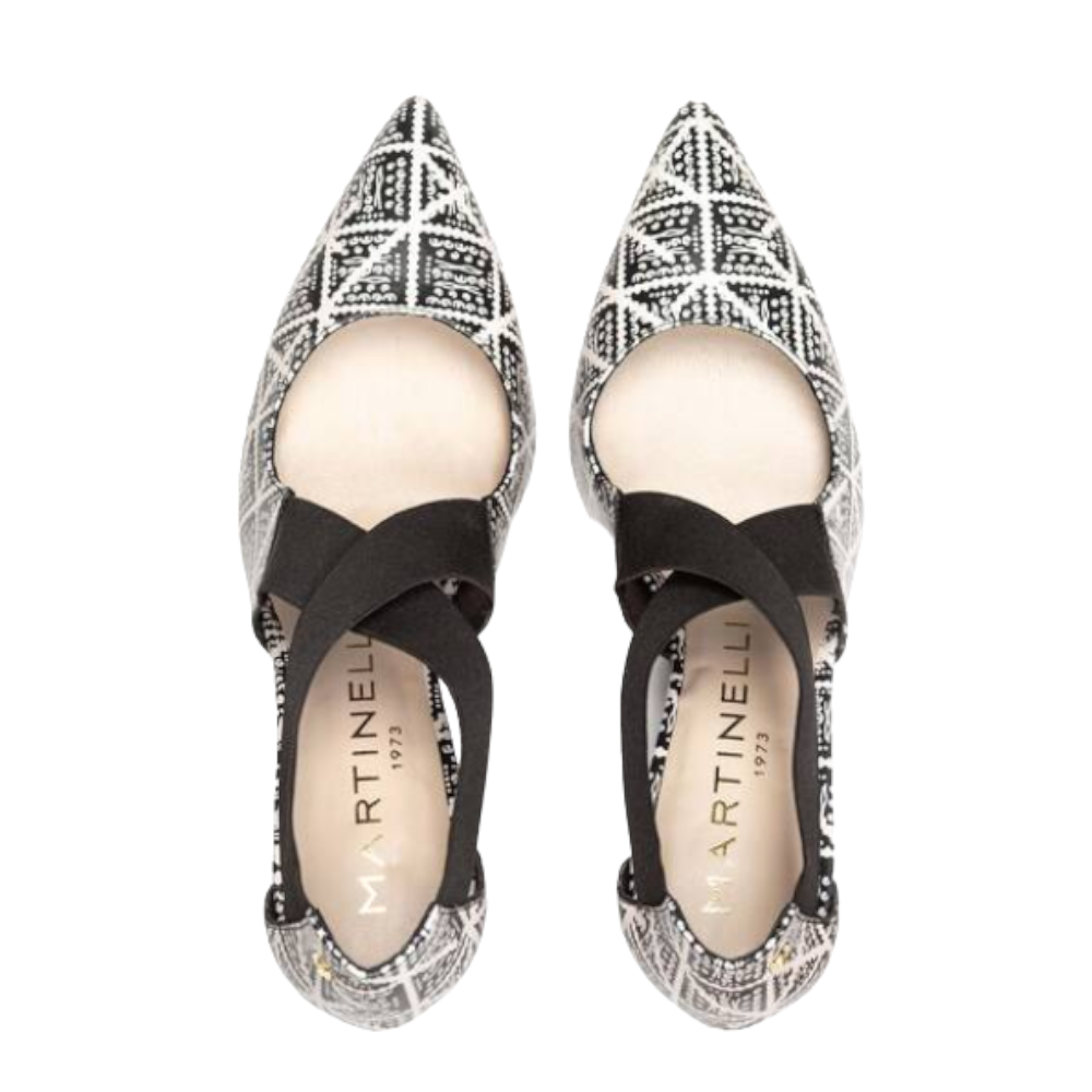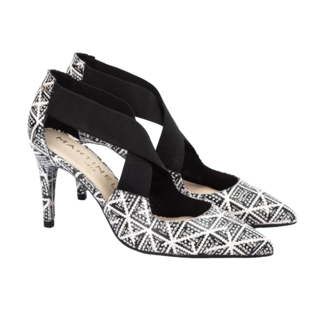 Modelo atado cruzado en el empeine con el talón alto y elegante, combina estampado étnico y elásticos en color negro.