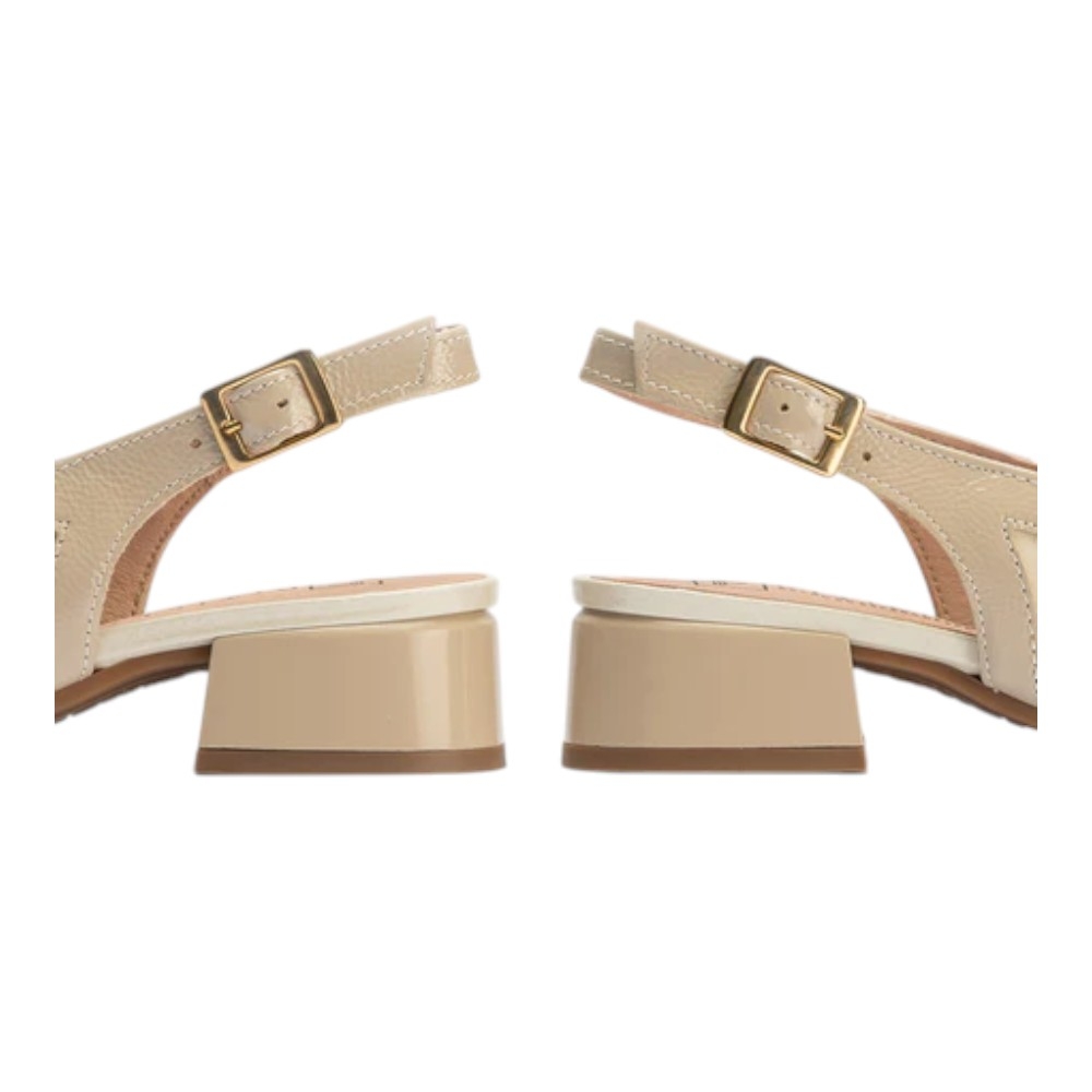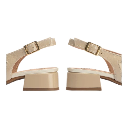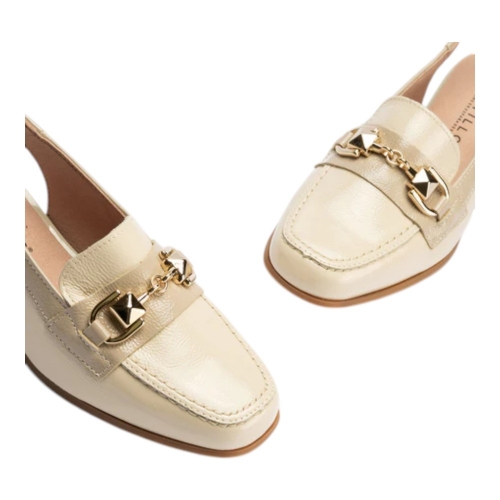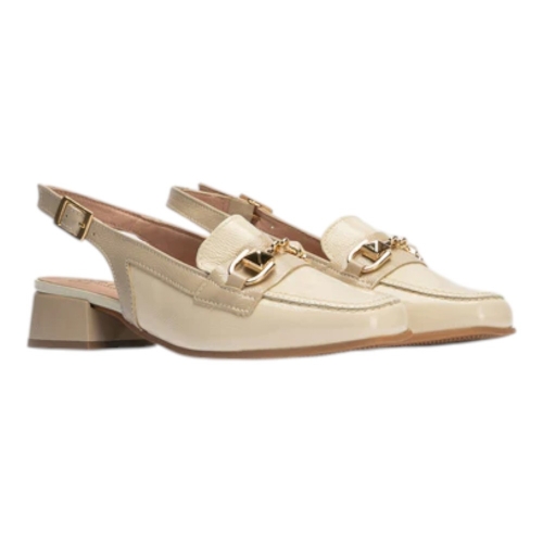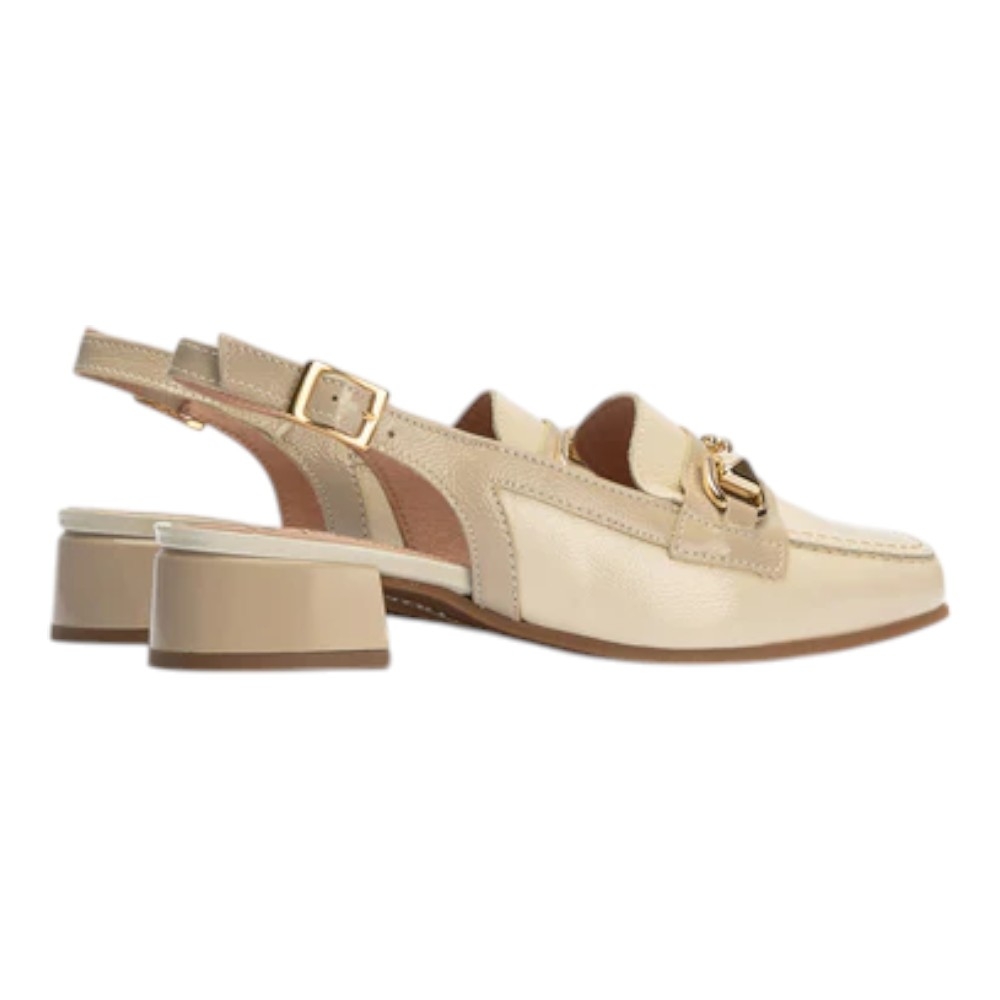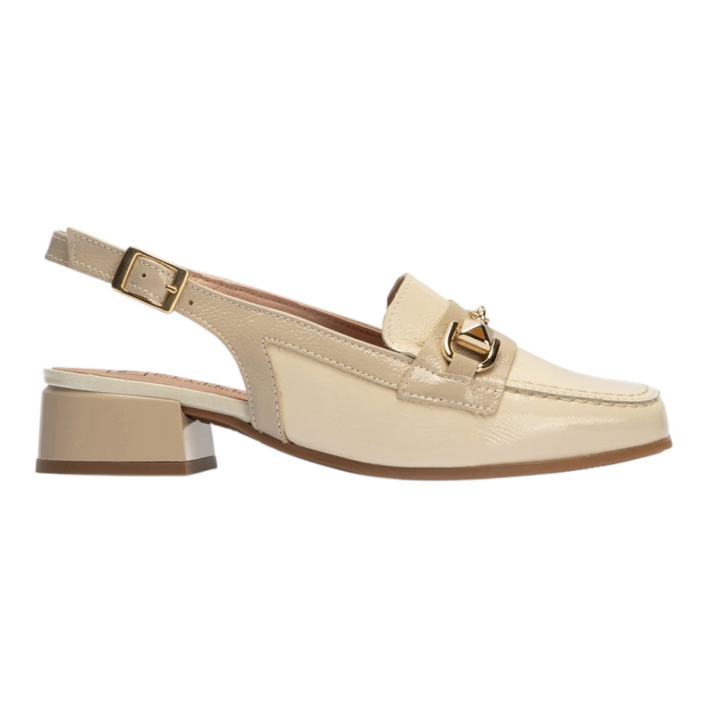 Confeccionado en piel charol de alta calidad, este mocasín destaca por su brillo sutil y su tacto elegante. El diseño de punta cuadrada aporta un toque moderno y sofisticado, mientras que el detalle de la hebilla añade un elemento distintivo y de tendencia. Su silueta de talón abierto proporciona frescura y libertad de movimiento, ideal para los días cálidos.