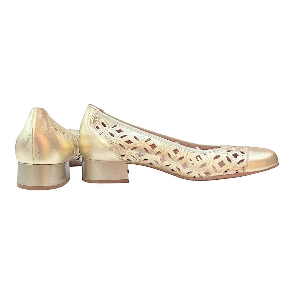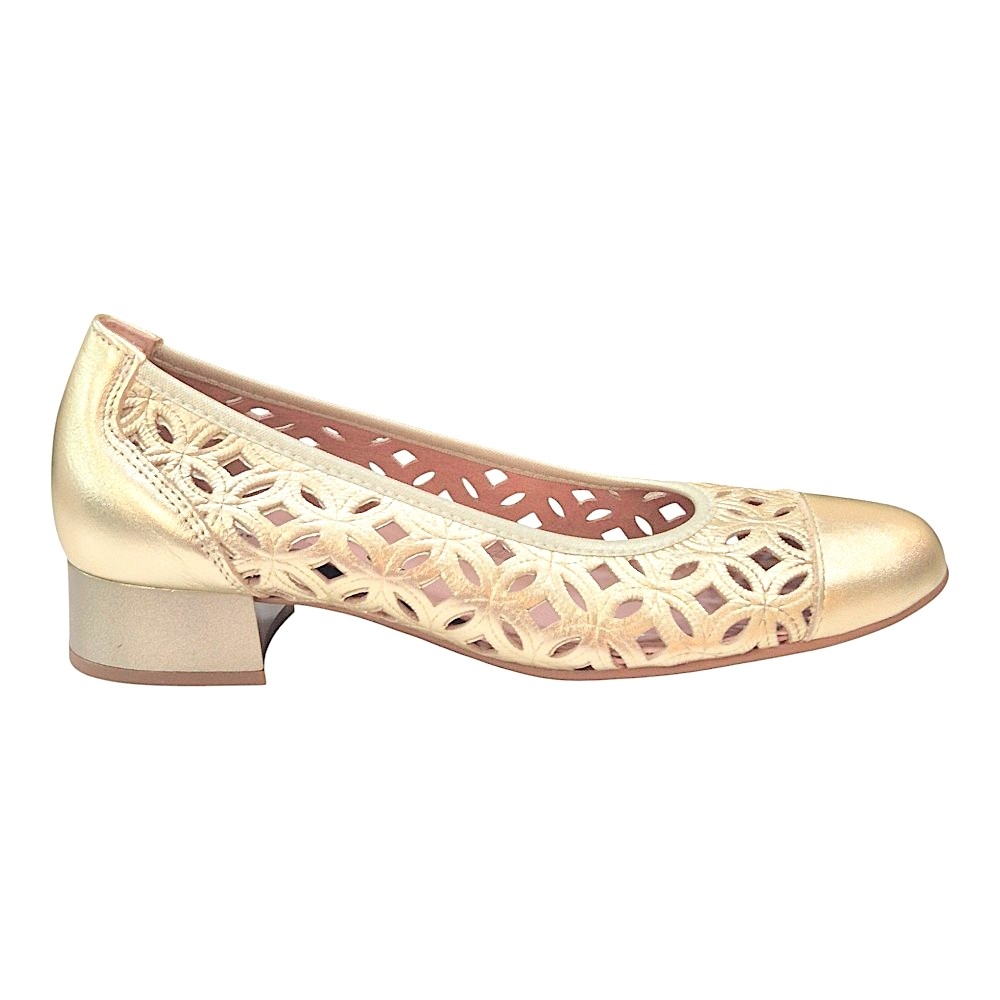 Este modelo destaca por su espectacular cuerpo calado con motivos geométricos, un detalle que no solo aporta una estética romántica y ligera, sino que garantiza una transpirabilidad excepcional, manteniendo tus pies frescos incluso en los días más cálidos. La puntera cerrada en acabado liso metalizado ofrece un contraste moderno y refuerza la estructura del zapato, asegurando una silueta estilizada.