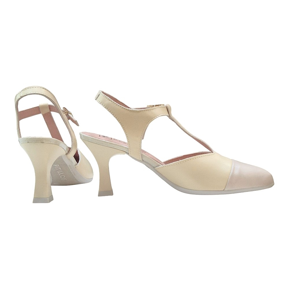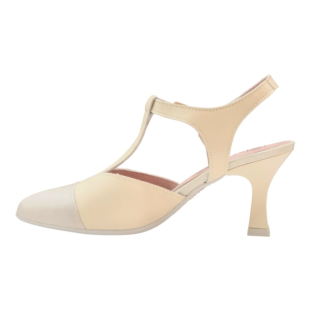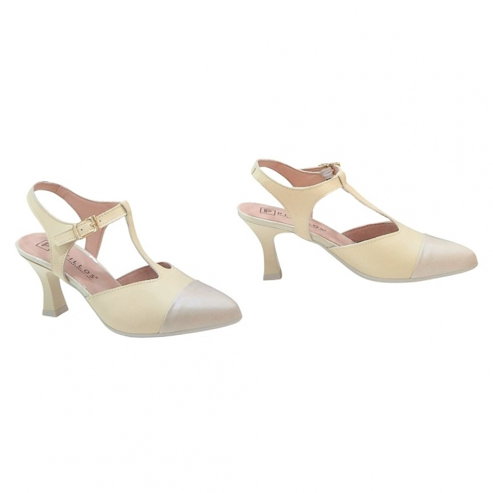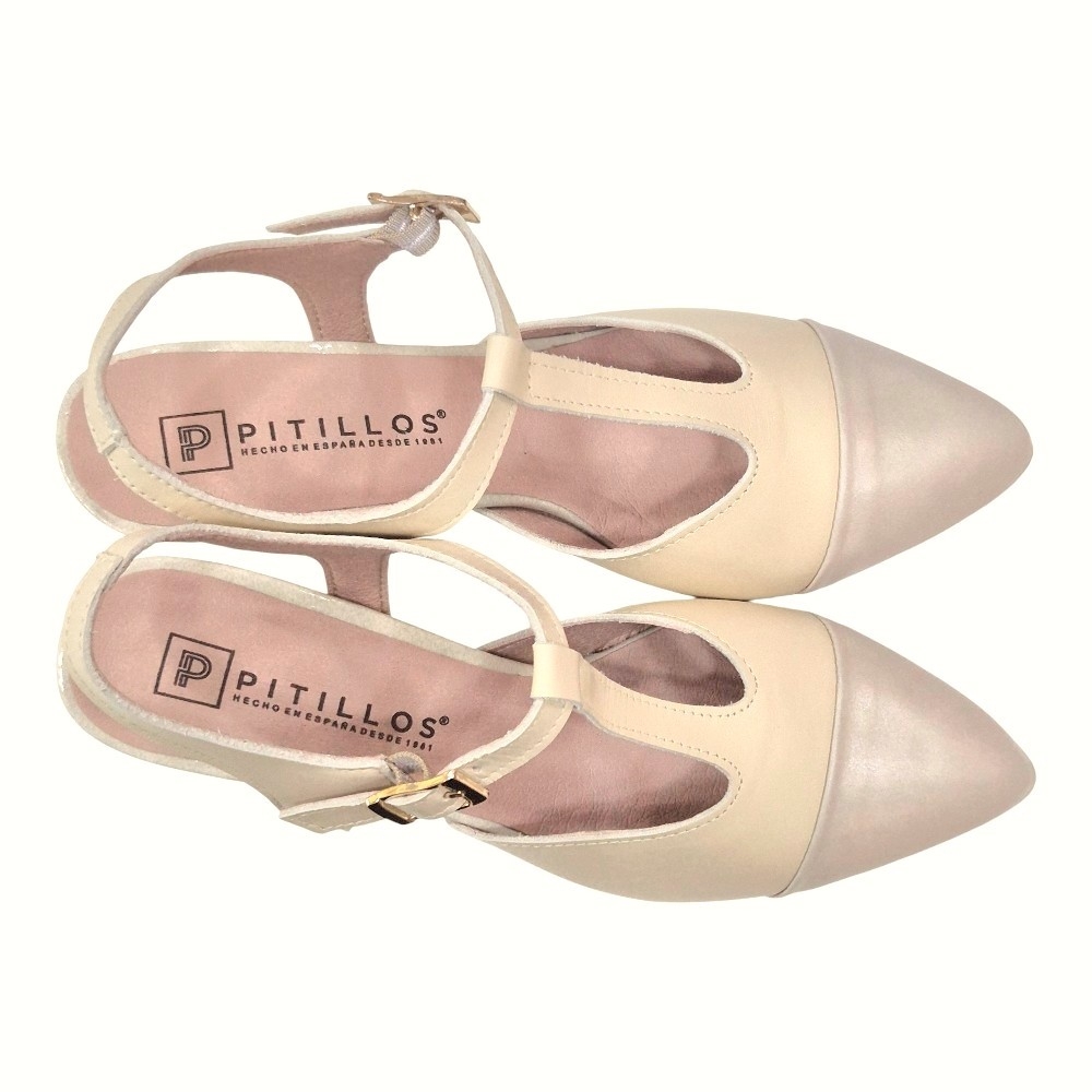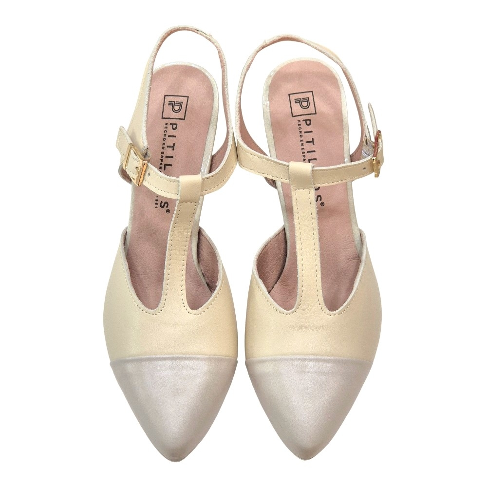 Fabricado íntegramente en España, este modelo destaca por su exquisita combinación de texturas. El cuerpo del zapato presenta un suave acabado en color crema, que se complementa magistralmente con una puntera reforzada en un tono nacarado sutil, aportando un brillo elegante y mayor durabilidad a la zona de mayor roce.