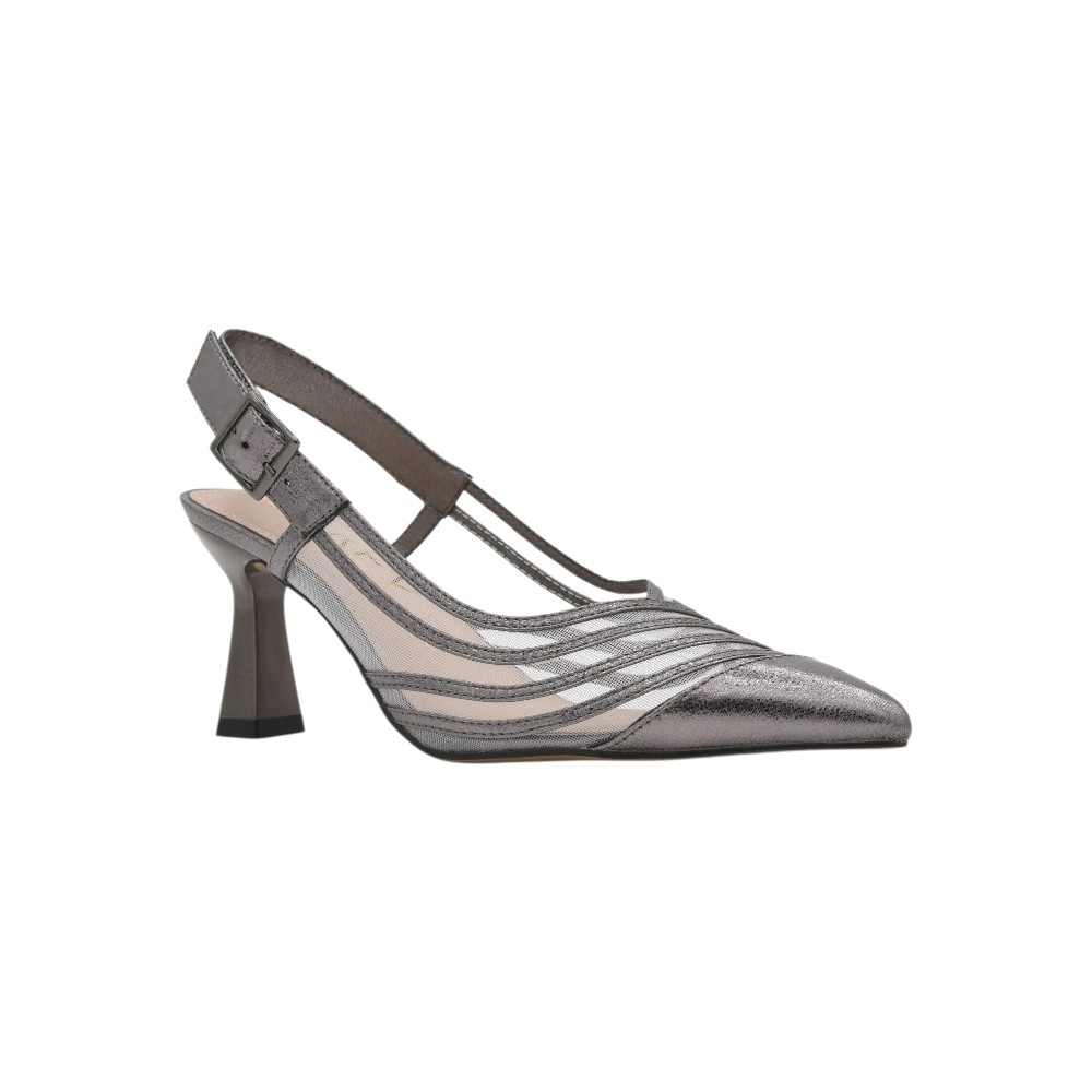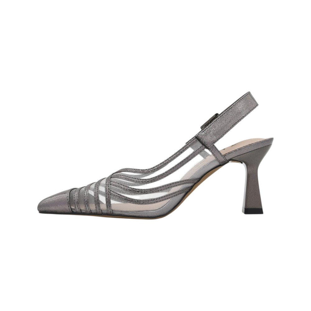 Eleva tu estilo con la elegancia contemporánea de Azarey. Este salón destalonado en color plomo metalizado es la definición de sofisticación moderna. Su diseño único destaca por un delicado juego de transparencias y líneas onduladas en mesh, que no solo estilizan el pie, sino que crean un efecto visual ligero, vanguardista y profundamente femenino.