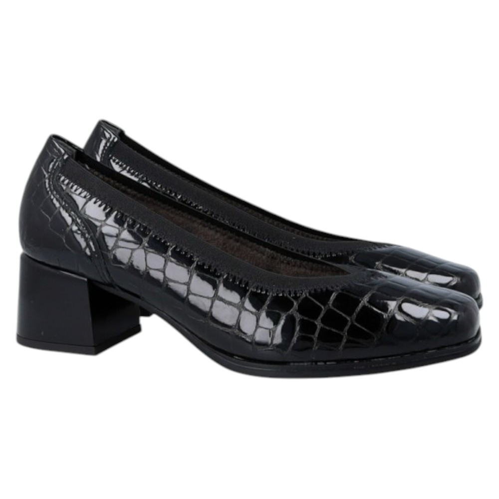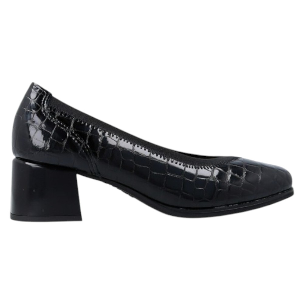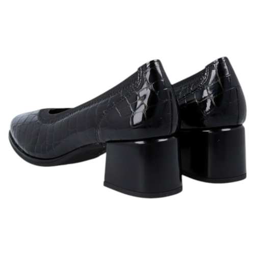 Diseño Sofisticado: Elaborado en piel charol con un elegante grabado efecto cocodrilo en color negro, aportando un toque de distinción y modernidad a la silueta tradicional del zapato de salón.