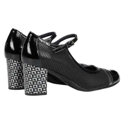 Diseño: Destacan por su sofisticada combinación de texturas. El cuerpo del zapato presenta un patrón de cuadros en relieve, mientras que la puntera y la correa del tobillo están acabadas en charol brillante. El tacón de 7 cm, con su llamativo diseño geométrico en tonos antracita, añade un toque artístico y moderno.
